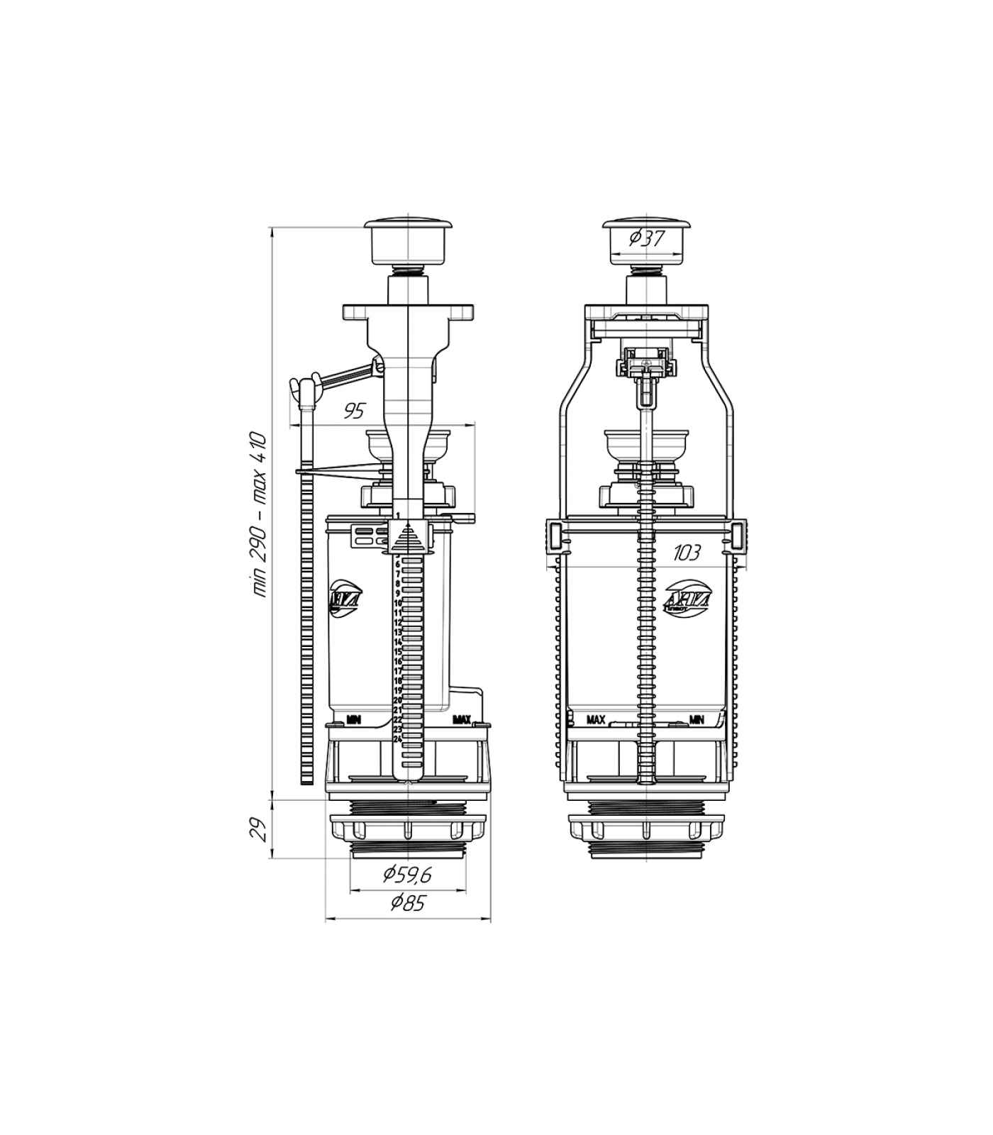 Клапан выпуска кнопочный АНИ WC7010 арматура спускная. Сливной механизм бачка унитаза белая пластиковая кнопка с одним режимом слива, имеет возможность регулировки по высоте от 290 до 410 мм.