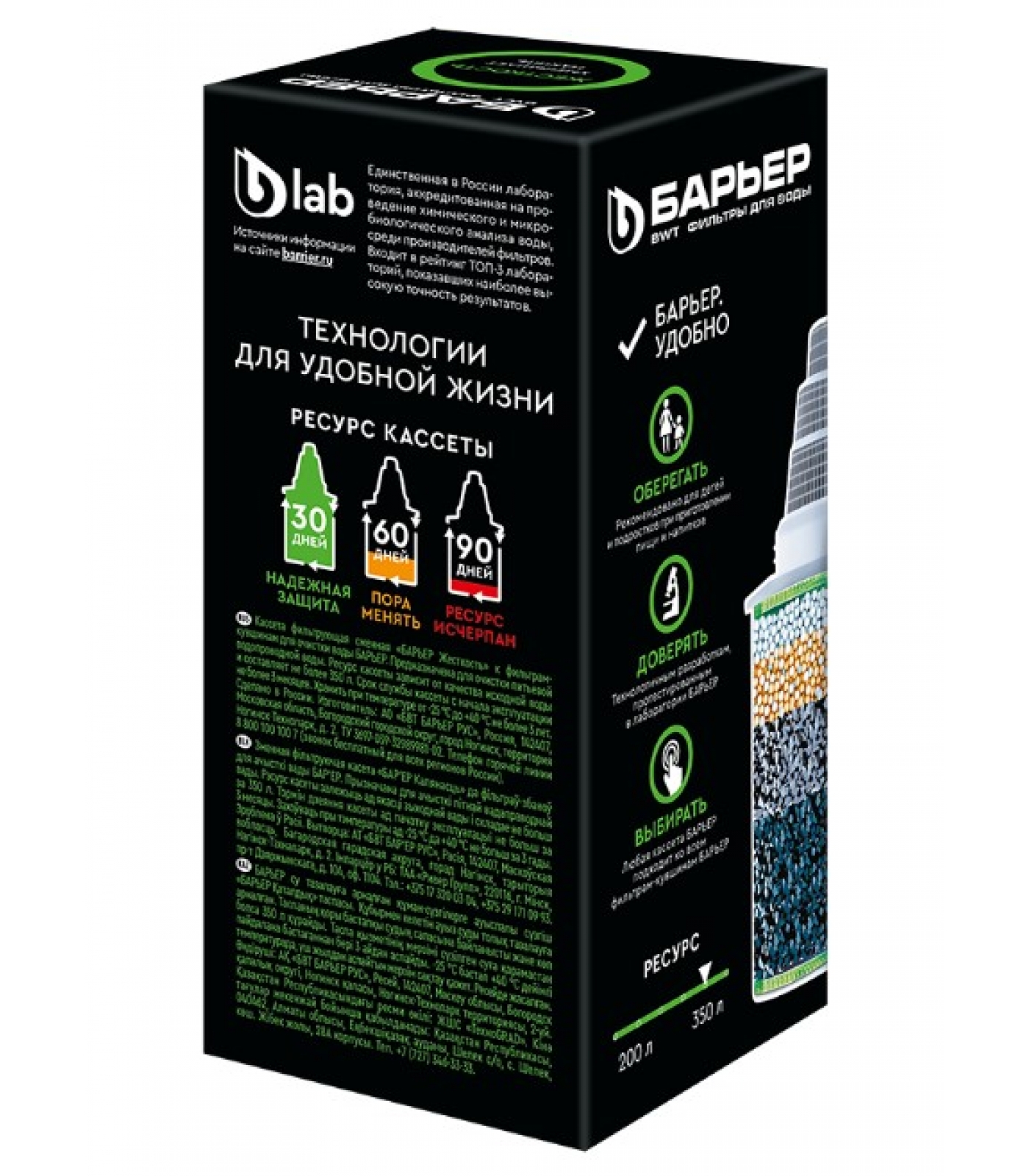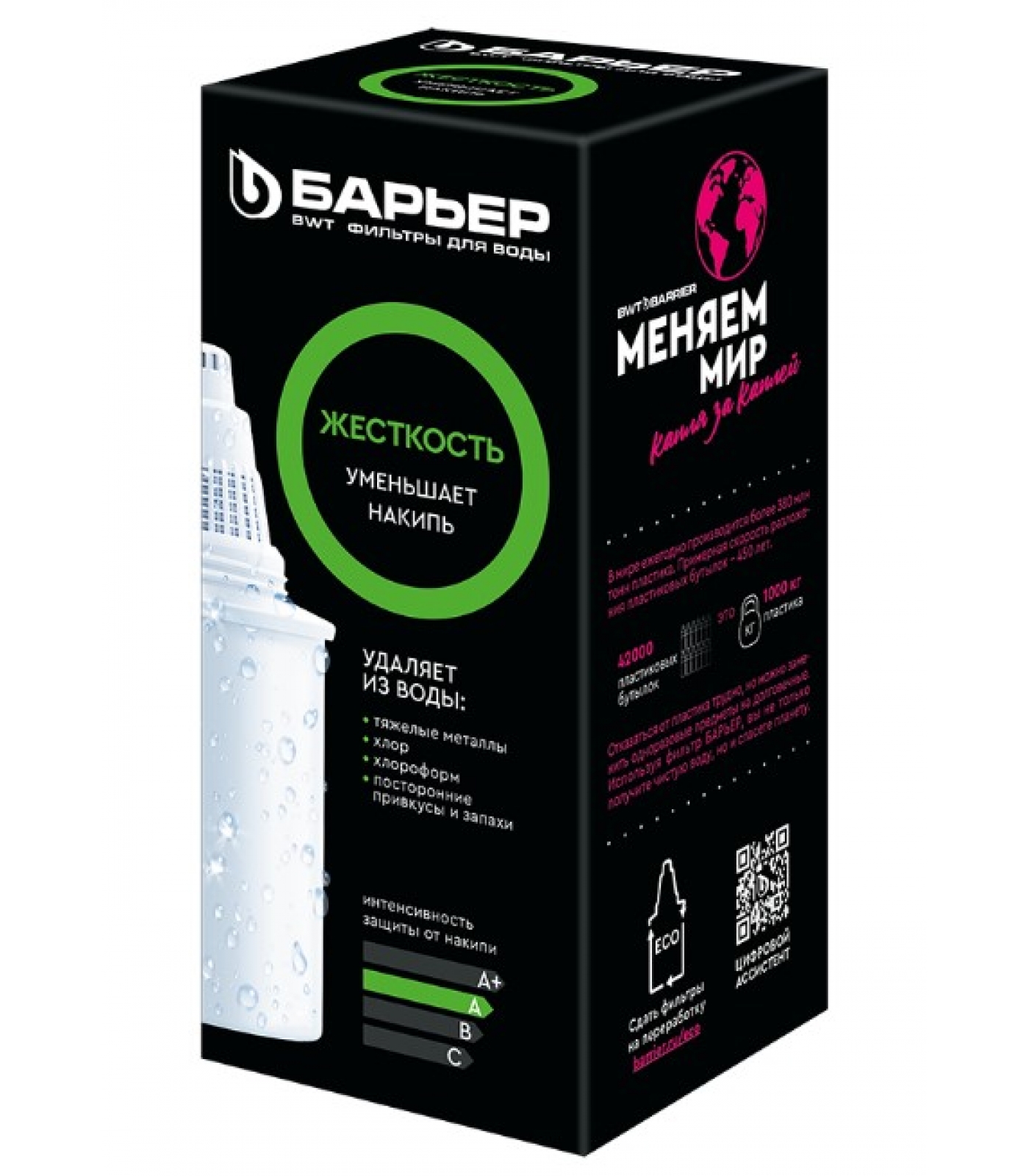 С фильтрами БАРЬЕР вам не придется запоминать размер или диаметр сменной кассеты: любая кассета БАРЬЕР подходит ко всем фильтрам-кувшинам БАРЬЕР. А герметичное резьбовое соединение исключает попадание неочищенной воды в отфильтрованную.