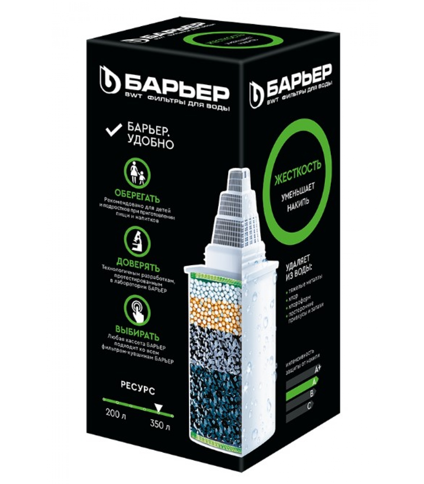Сменная кассета для фильтра БАРЬЕР Жесткость предназначена для очистки воды от солей жесткости, которые мы привыкли встречать в жизни в виде накипи в чайнике, кофе-машине и налете на кухонном кране. Кассета БАРЬЕР Жесткость снижает образование накипи, а также удаляет основные вредные примеси, оставляя только свежую чистую воду. Ресурс — 350 литров.