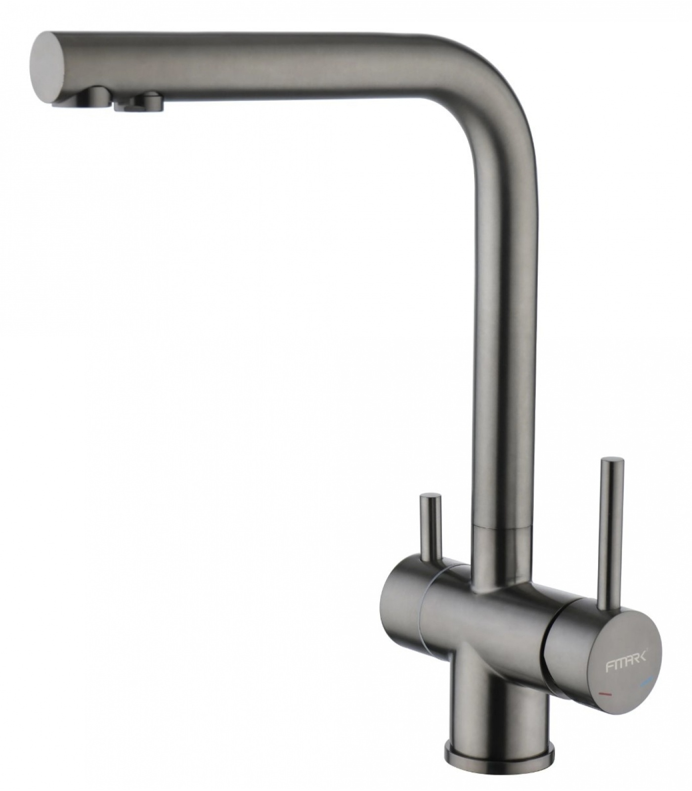 Fmark FS1362Q современный кухонный смеситель с раздельной подачей водопроводной и фильтрованной воды. Выполненный в эффектном цвете графит (воронёная сталь), он отличается лаконичным дизайном, прочной конструкцией из нержавеющей стали и продуманной эргономикой. Эта модель заменяет сразу два устройства — стандартный смеситель и отдельный кран для фильтра, экономя место и сохраняя стиль интерьера.