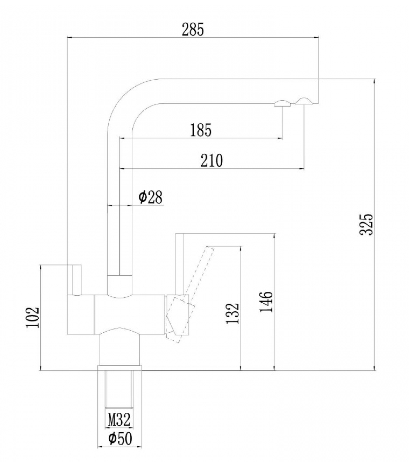 Излив с углом 90° — подчёркивает геометричную форму и обеспечивает удобную подачу воды.