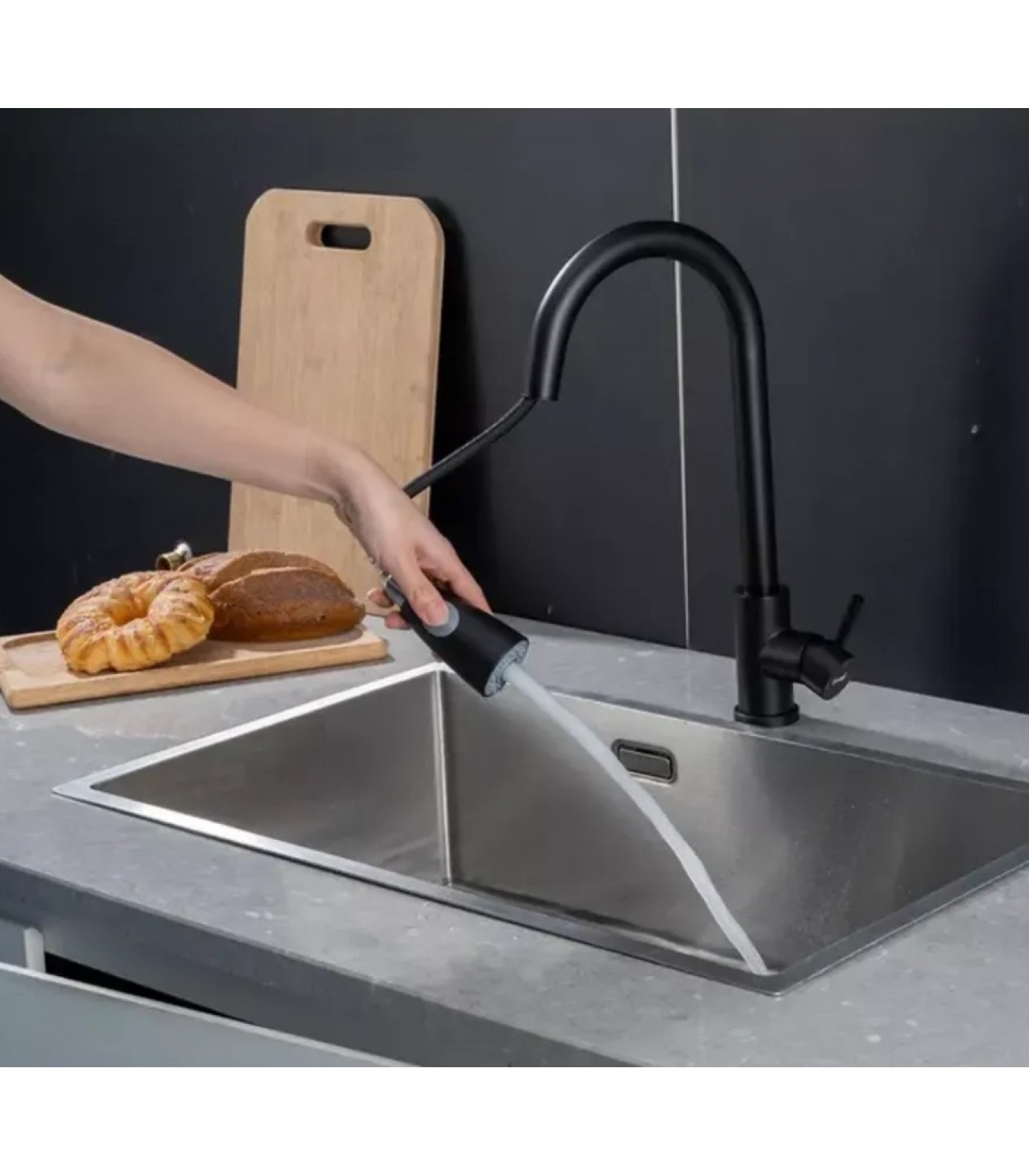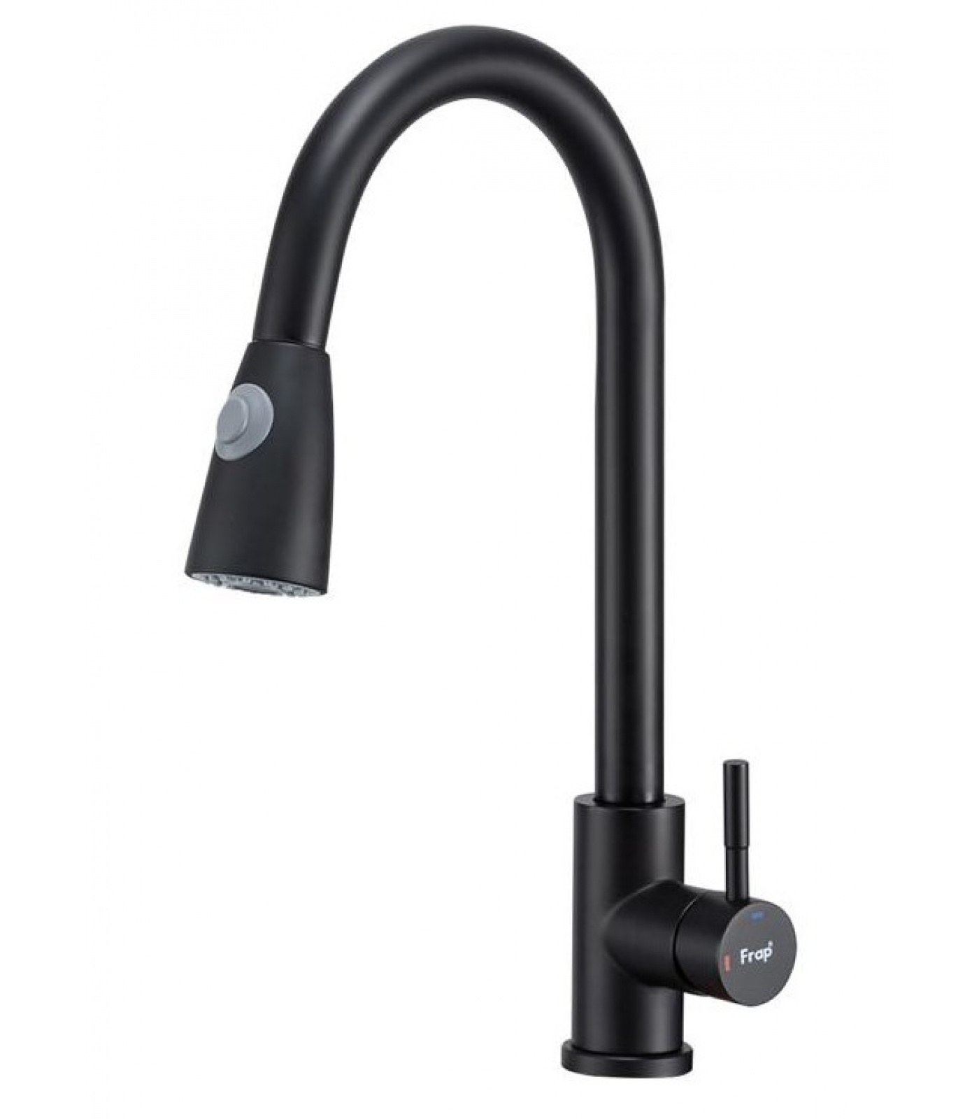 Современный смеситель для кухни Frap F60991-6 с удобной выдвижной лейкой в изливе, цвета черный.