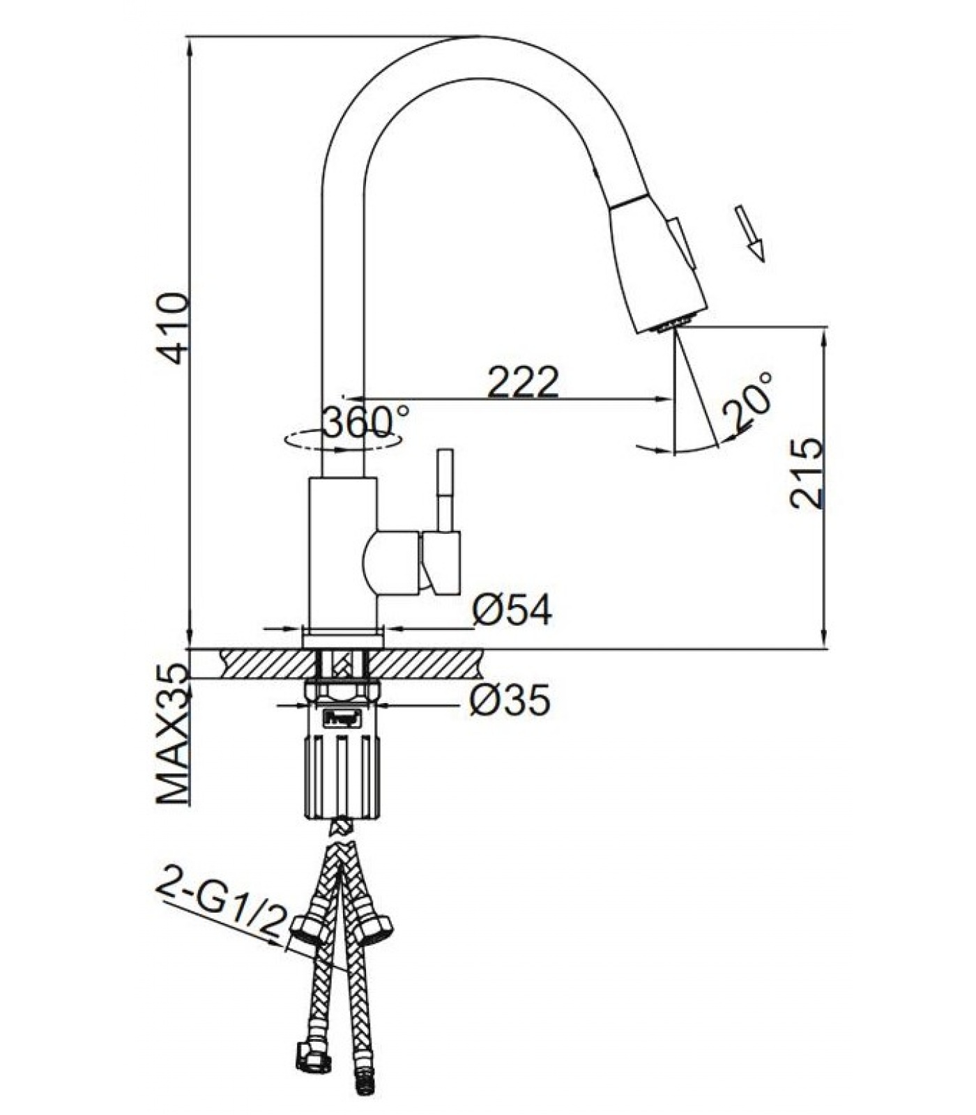 Поворотный выдвижной излив с переключением режима струя/душ.