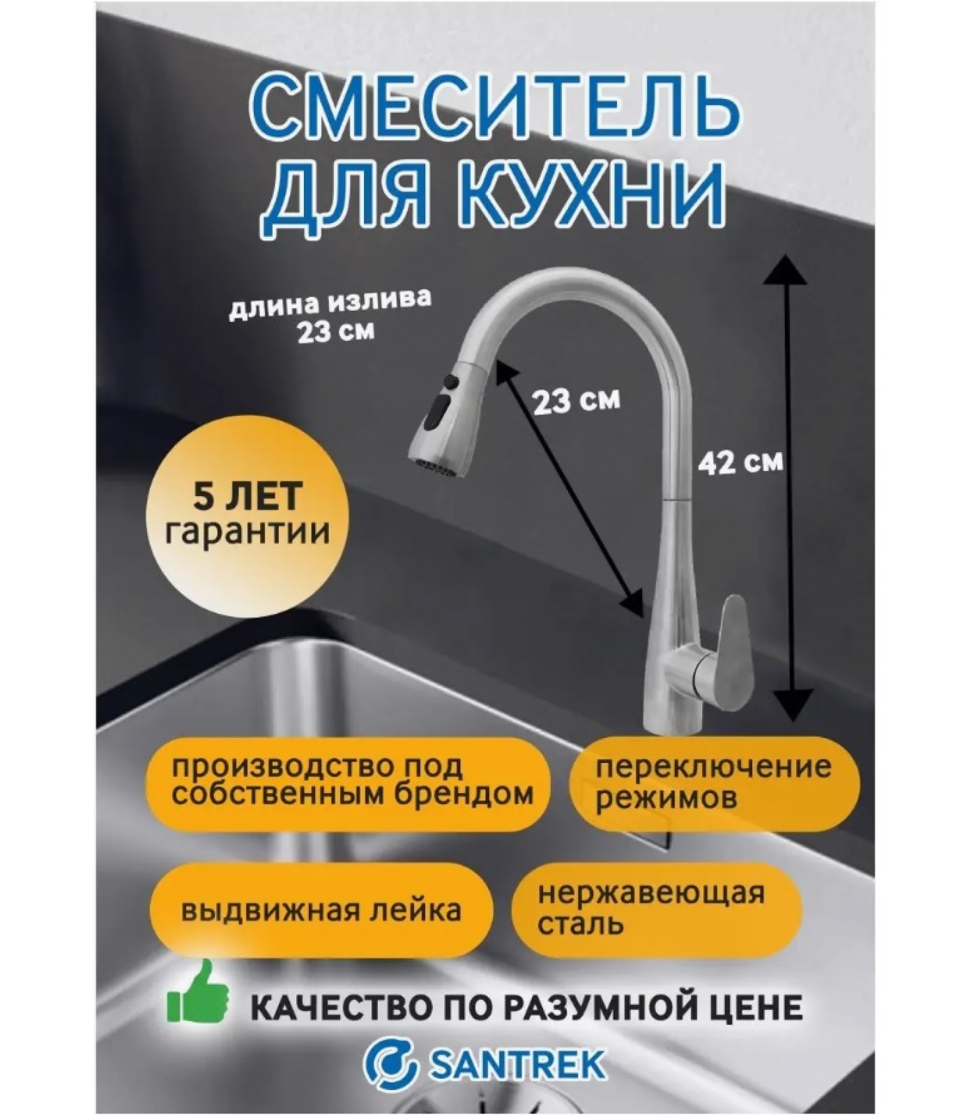 Смеситель для кухни Santrek Aqua 830 INOX нержавеющая сталь, выдвижной излив