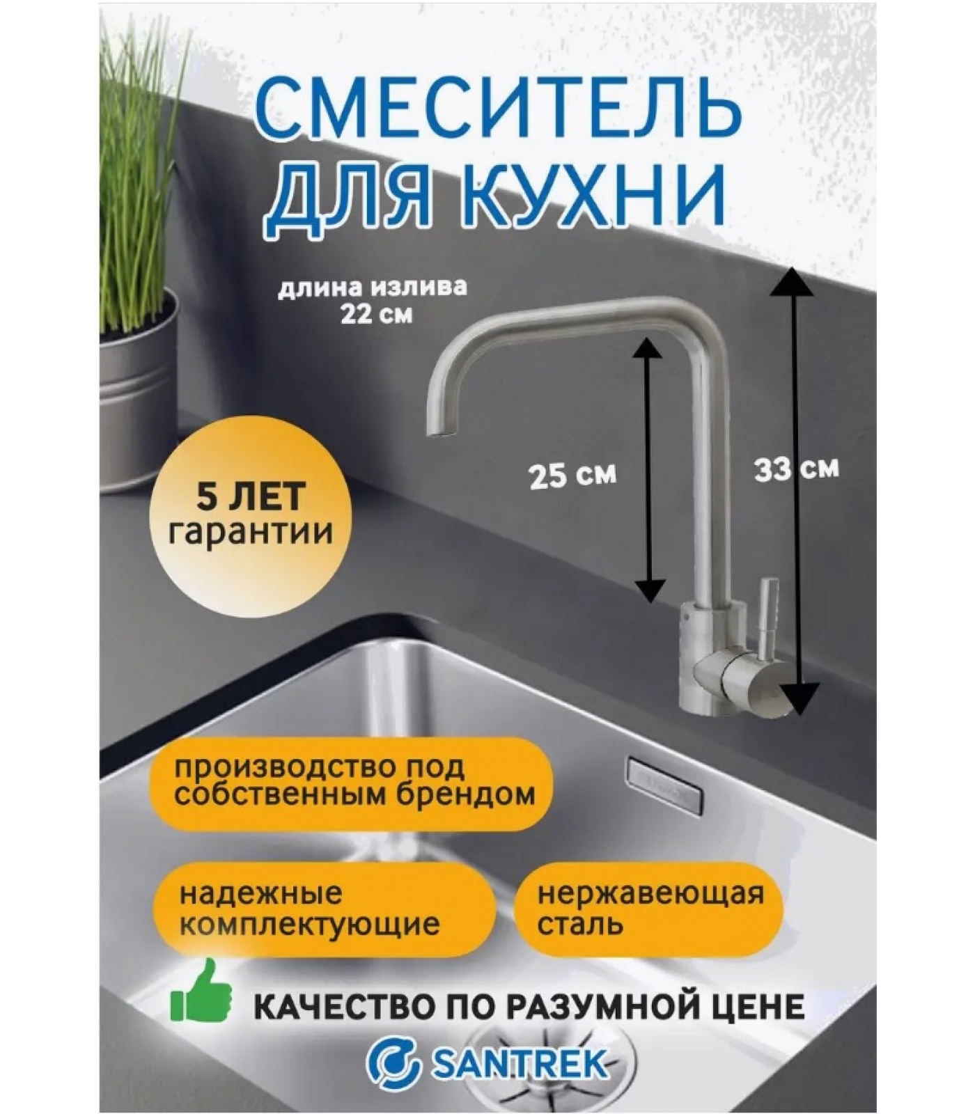 Смеситель для кухни SANTREK AQUA серии INOX с высоким Г-образным изливом и плавным переключателем станет незаменимым помощником в любом доме.