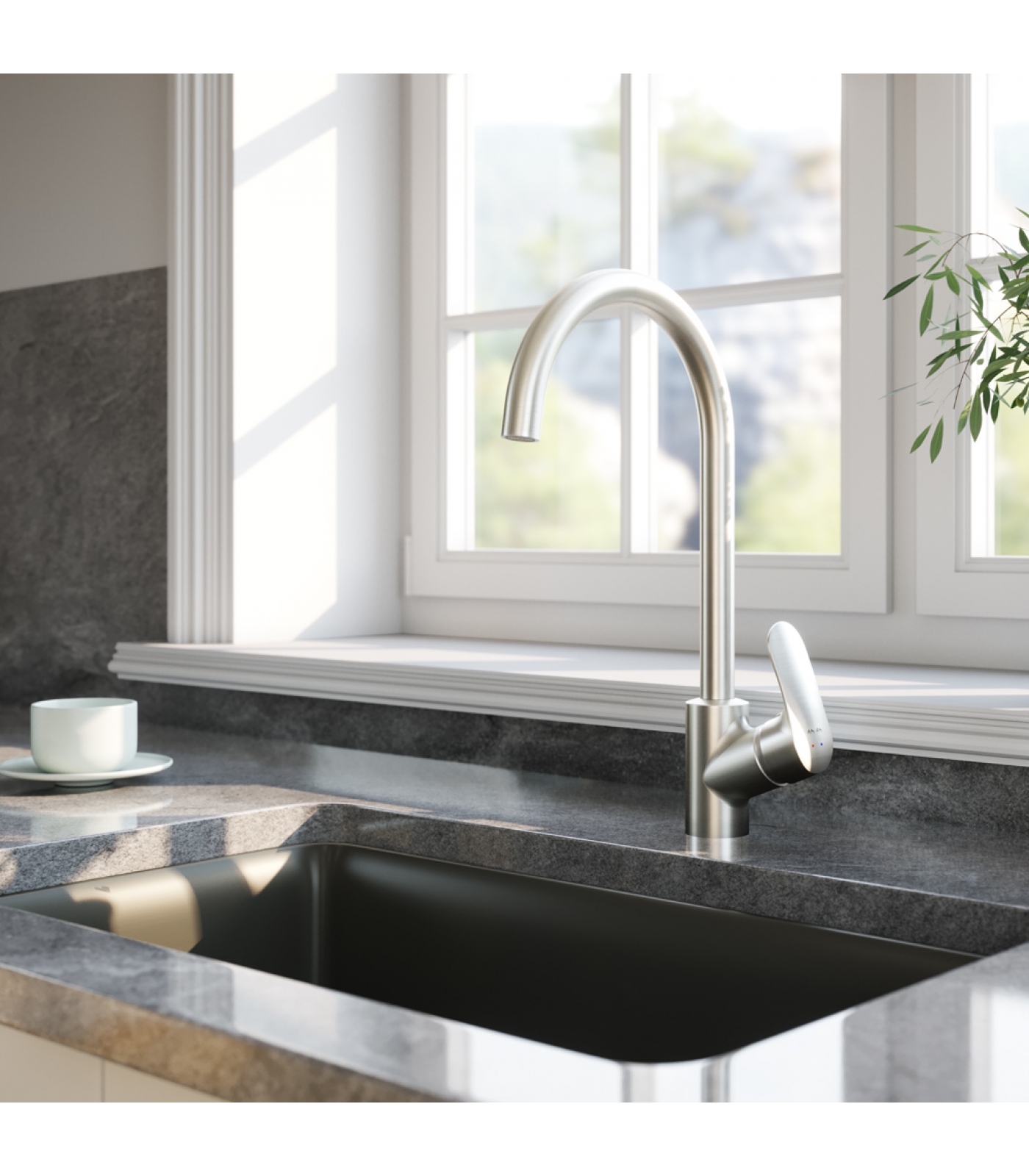 Максимальный комфорт: плавное вращение поворотного излива в любом направлении обеспечивает непревзойденное удовольствие от использования и удобство в работе на кухне.