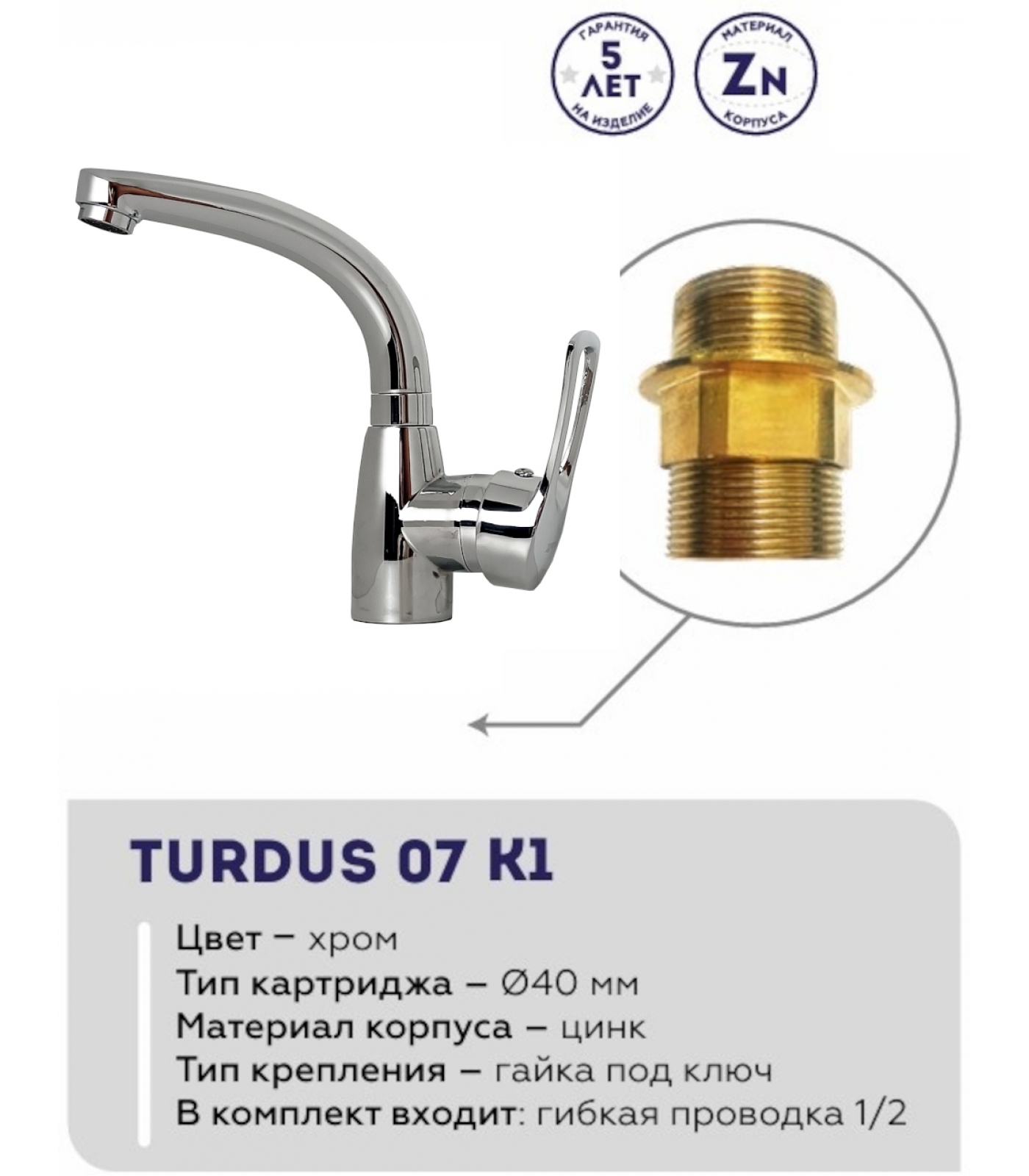 Смеситель для мойки или умывальника TURDUS 07 K1 имеет традиционный дизайн, прост в установке и использовании.