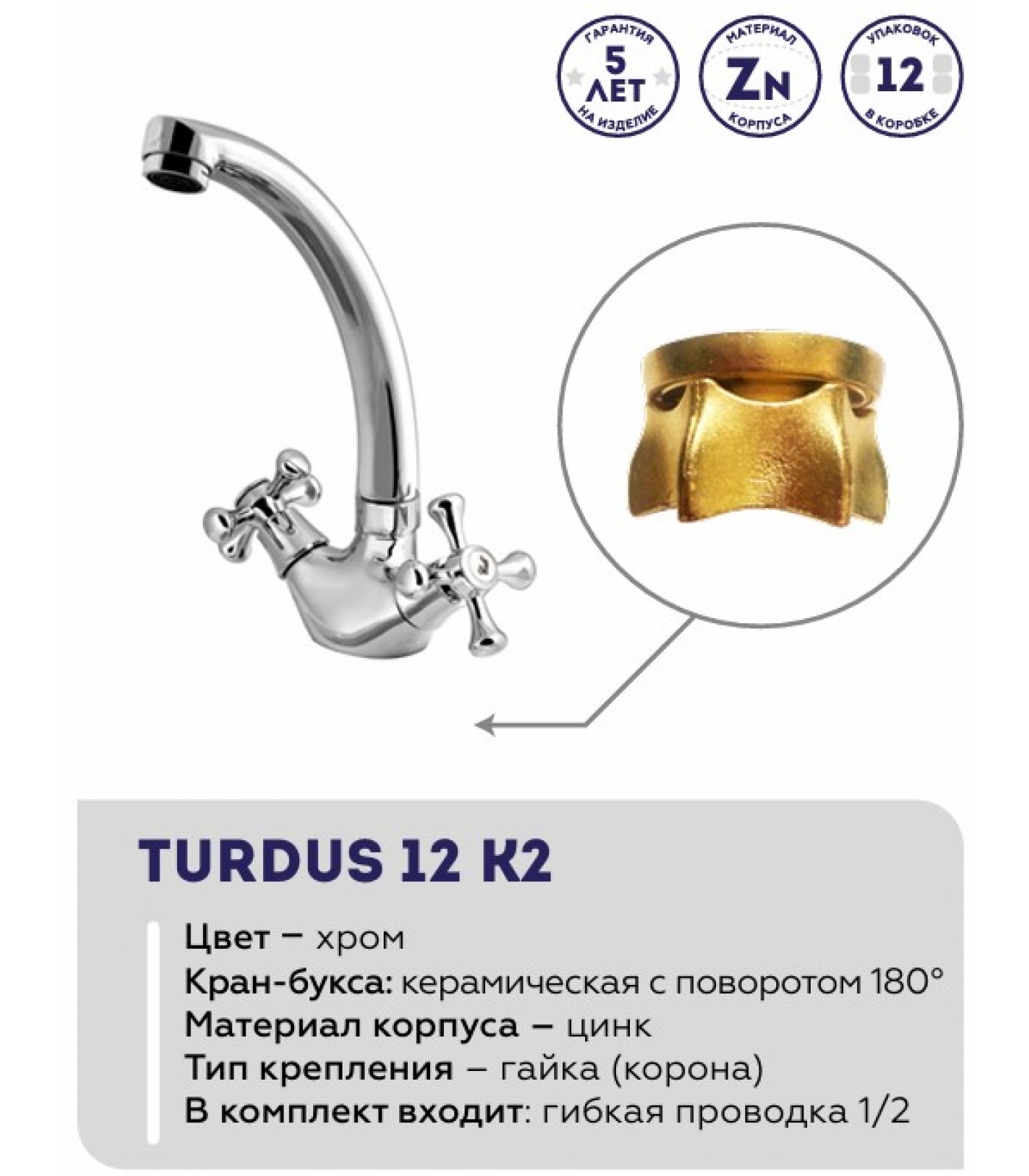 Смеситель для мойки TURDUS 12 K2 имеет традиционный дизайн, прост в установке и использовании.
