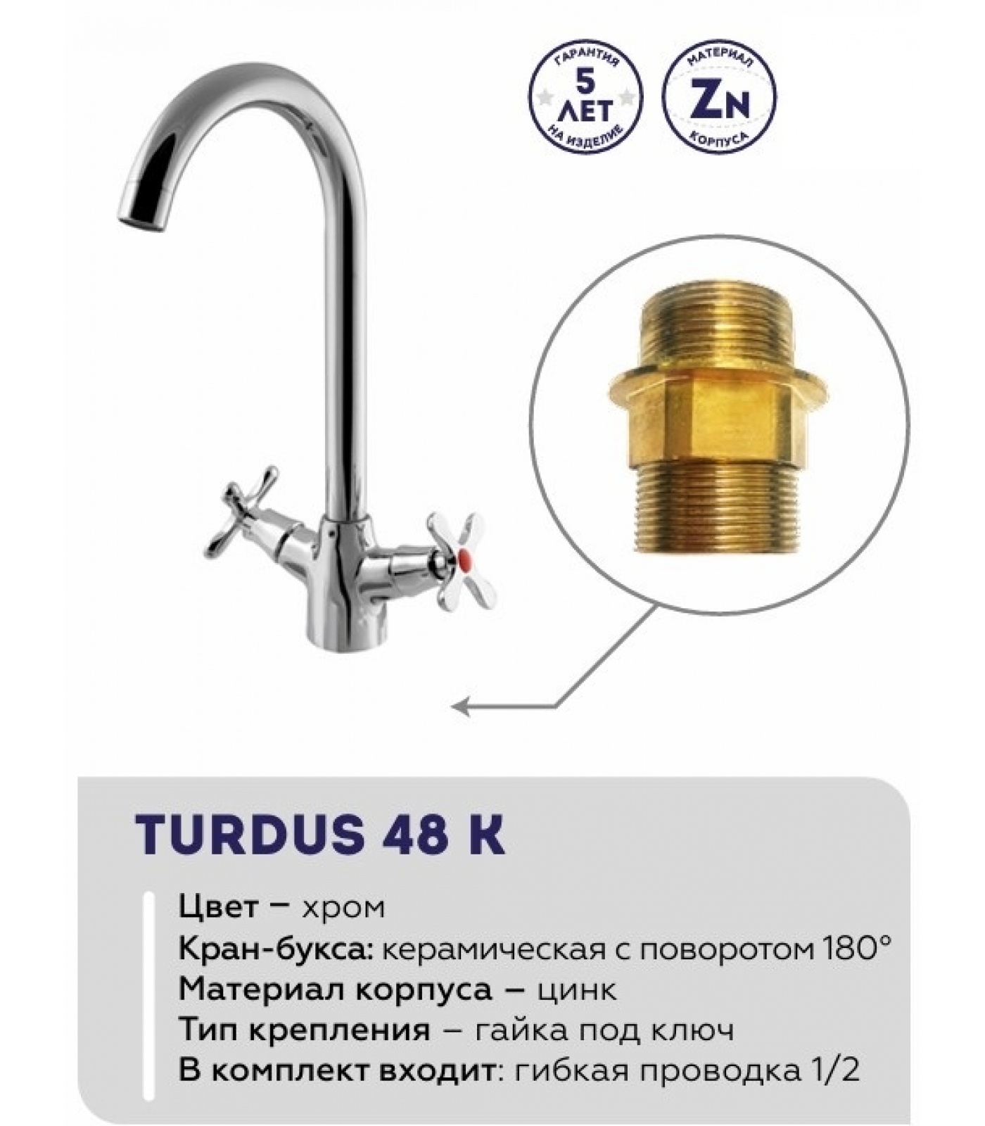 Смеситель для мойки TURDUS 48 K имеет традиционный дизайн, прост в установке и использовании.