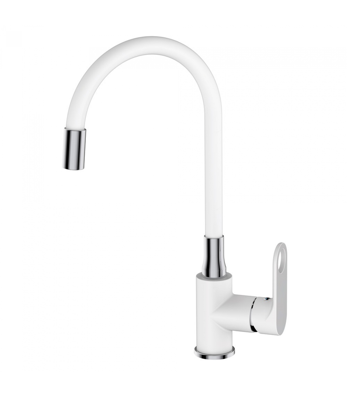 Белый гибкий излив смесителя делает его необычным и красивым. Белый смеситель с элементами хрома отлично сочетается с кухонными мойками любых размеров и оттенков.