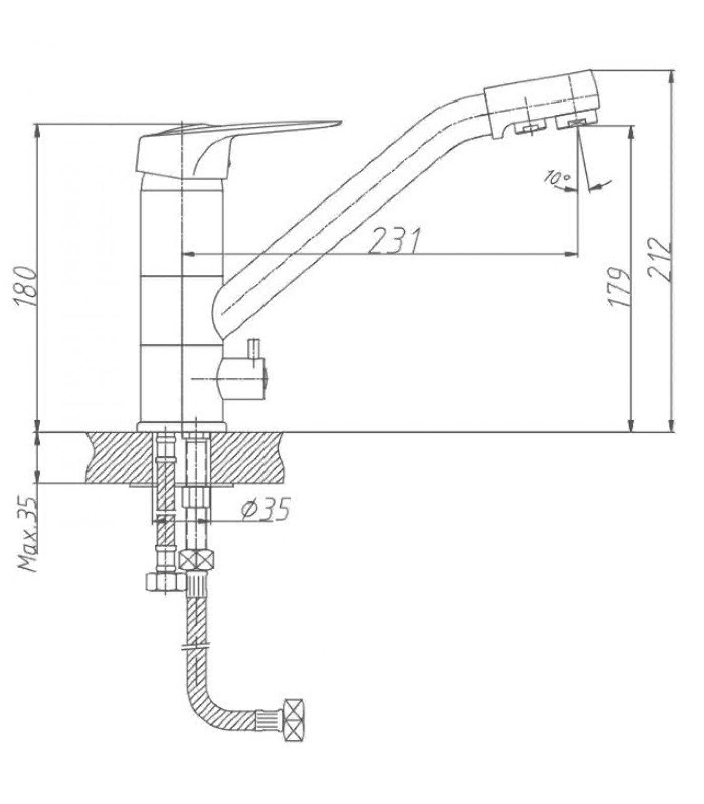 Смеситель для кухни с подключением фильтра бренда Valfex. Изготовлен из латуни. Картридж 40 мм. Укомплектован аэратором. Гибкая подводка 40 см. С поворотным изливом.