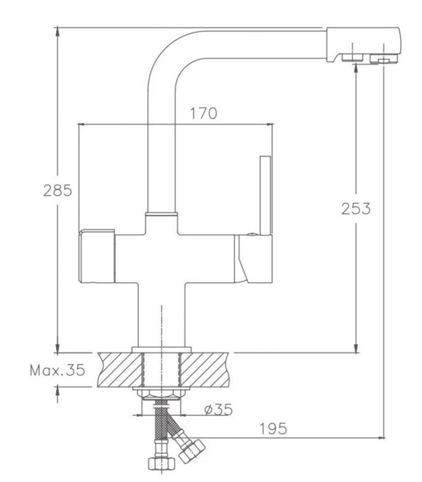 Смеситель для кухни с подключением фильтра бренда Valfex. Изготовлен из из нержавеющей стали. Картридж 35 мм. Укомплектован аэратором. Гибкая подводка 40 см. С поворотным изливом.