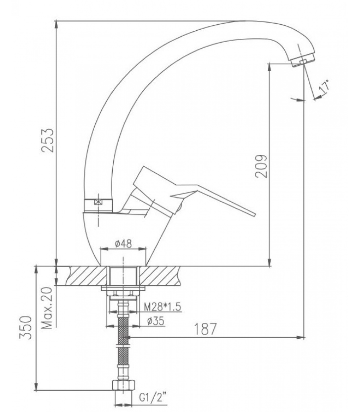 Смеситель для кухни бренда Valfex. Изготовлен из латуни. Картридж 40 мм. Укомплектован аэратором. Гибкая подводка 40 см. С поворотным изливом.