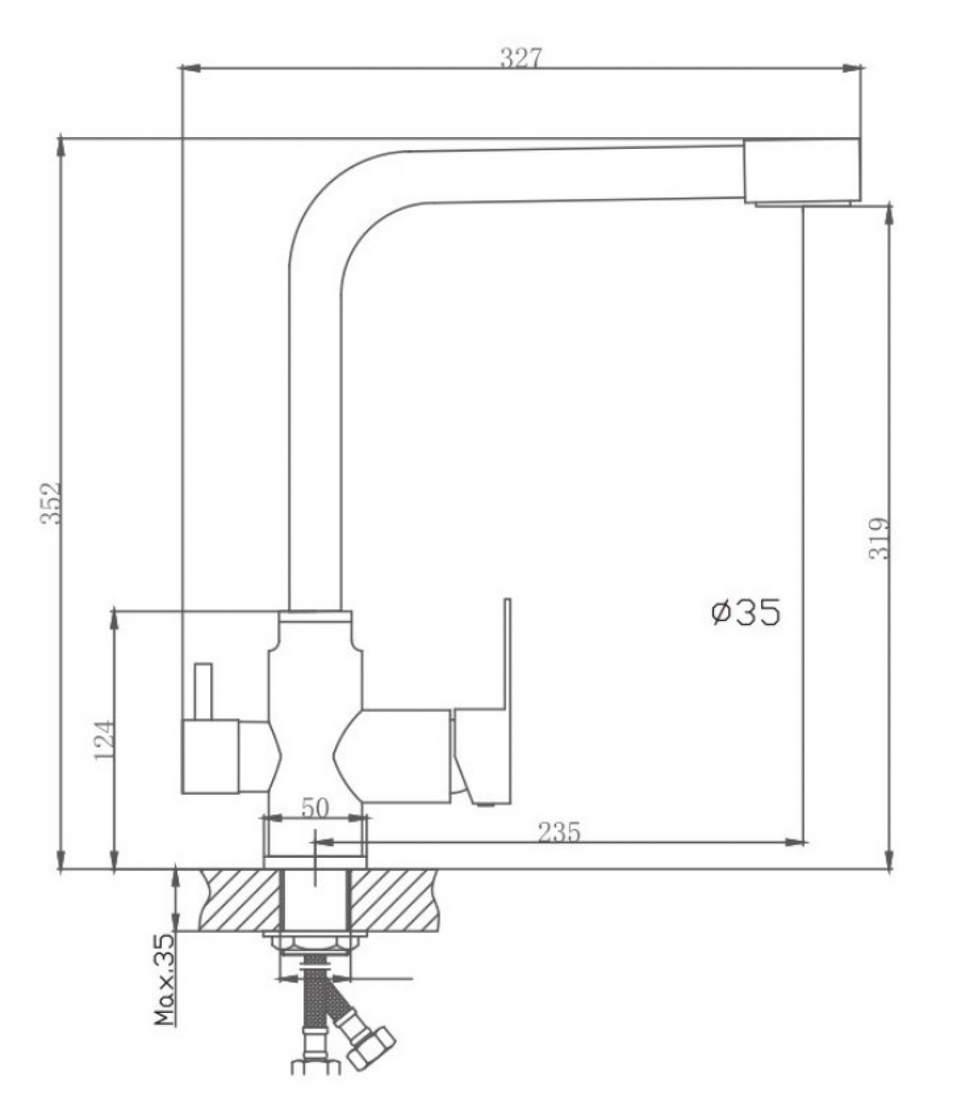 Смеситель для кухни бренда Valfex. Изготовлен из нержавеющей стали. Картридж 35 мм. Укомплектован аэратором. Гибкая подводка 40 см. С поворотным изливом.