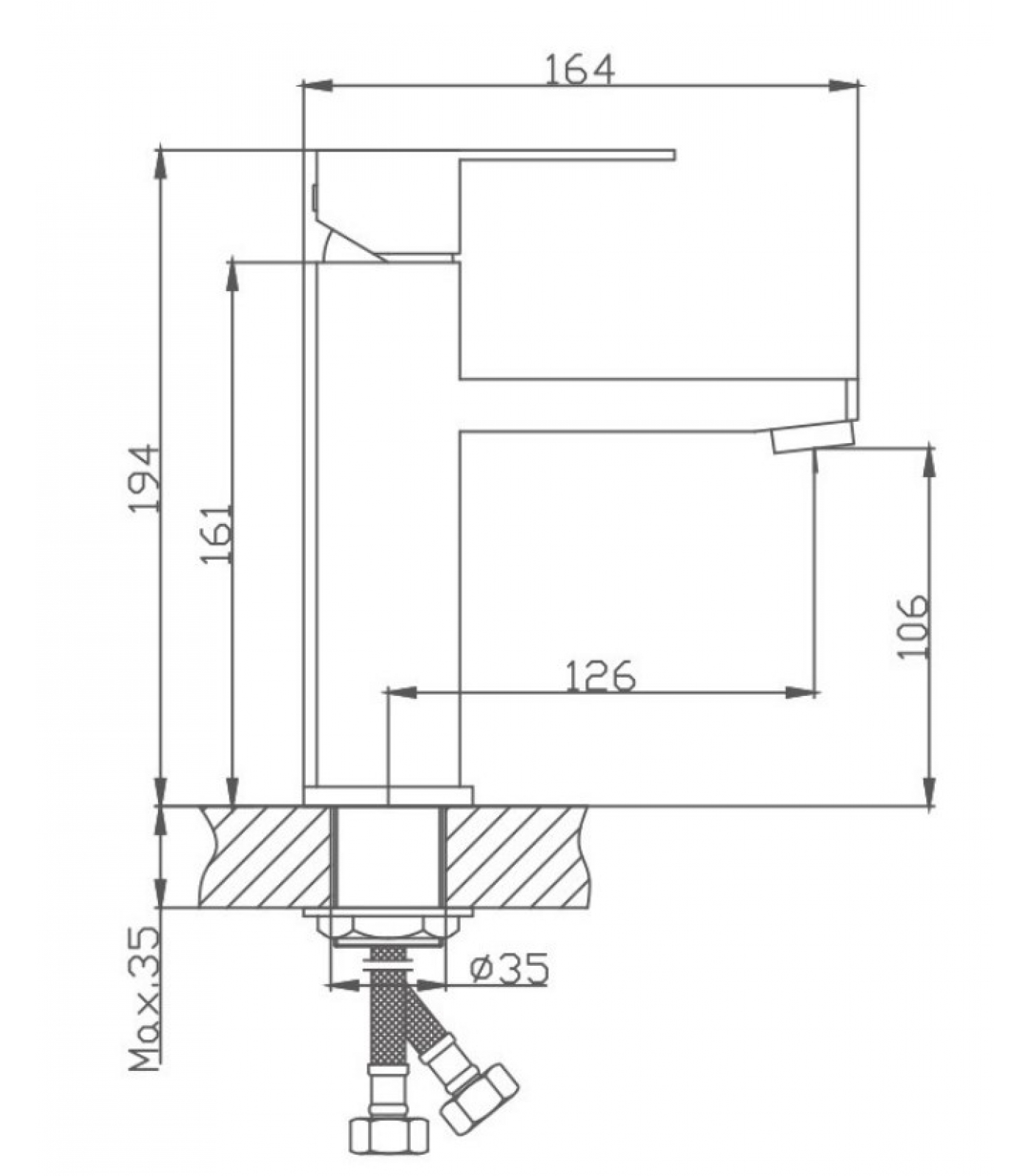 Смеситель для раковины Valfex. Изготовлен из нержавеющей стали. Керамический картридж 35 мм. Максимальная глубина монтажа 35 мм. Диаметр монтажного отверстия 35 мм.