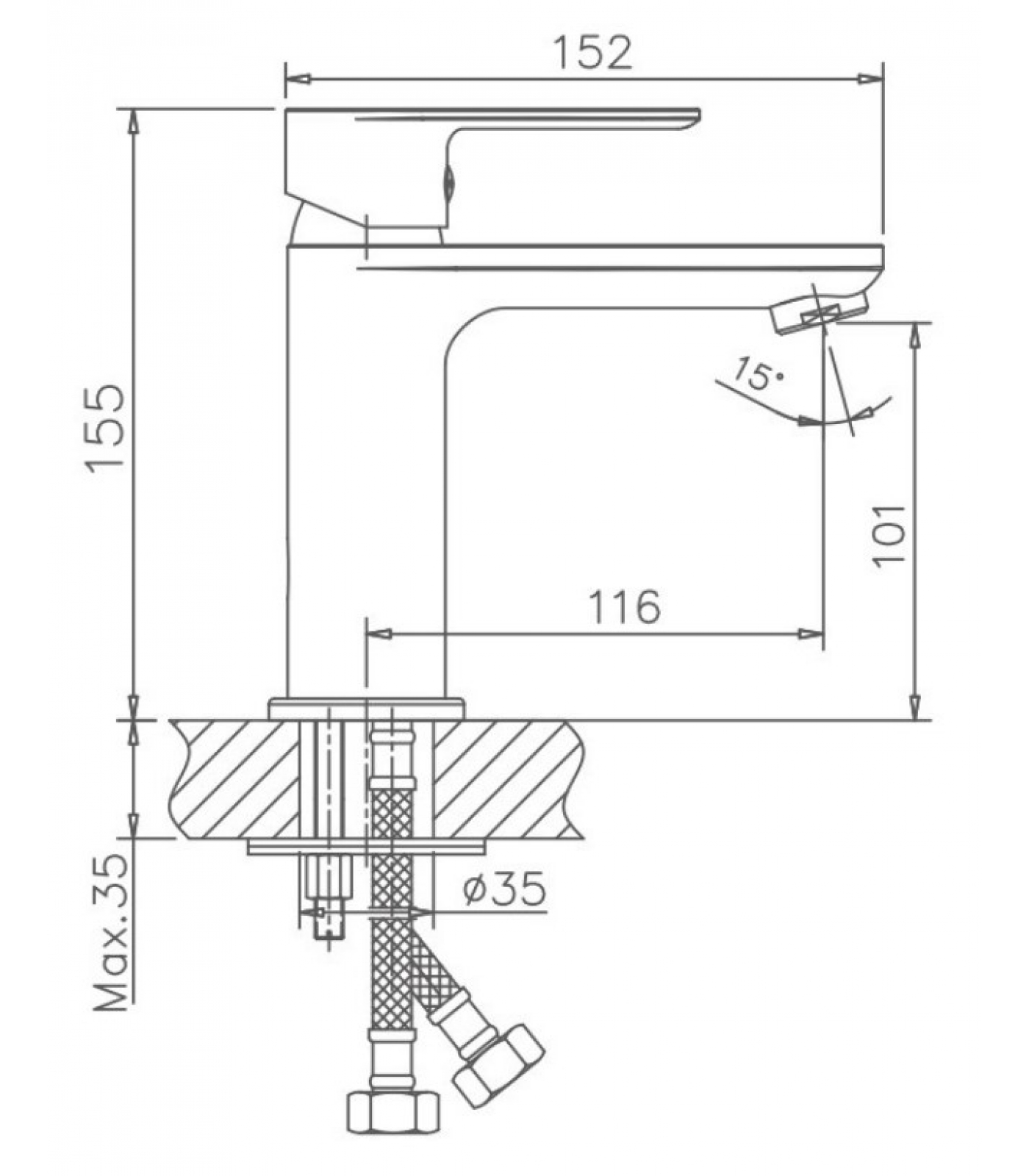 Смеситель для раковины Valfex. Керамический картридж 35 мм. Изготовлен из латуни. Максимальная глубина монтажа 35 мм. Диаметр монтажного отверстия 35 мм.