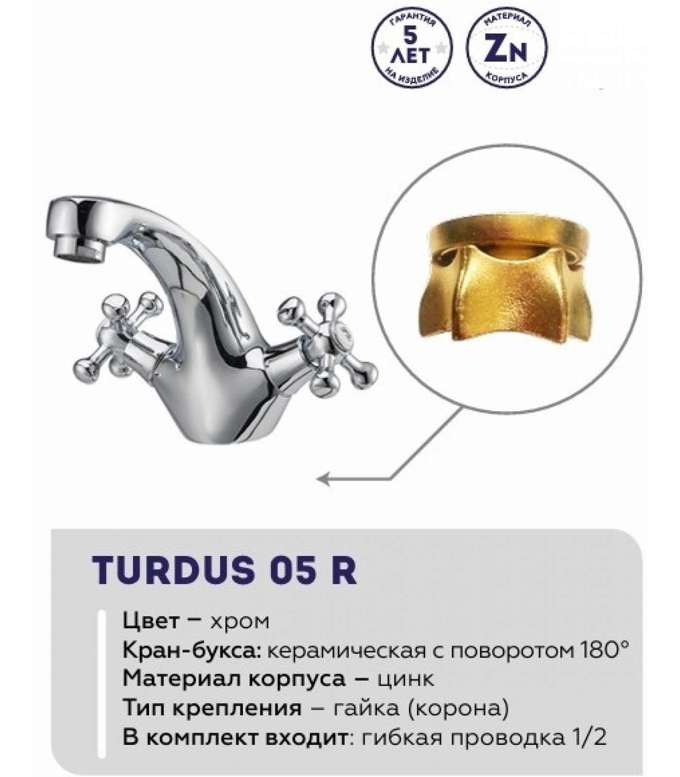 Смеситель для раковины TURDUS 05R имеет традиционный дизайн, прост в установке и использовании.