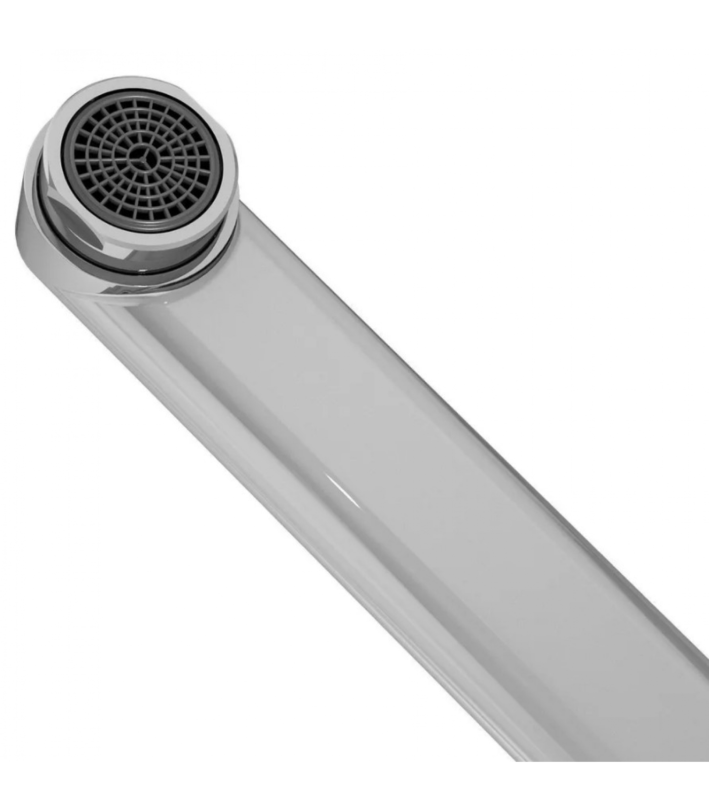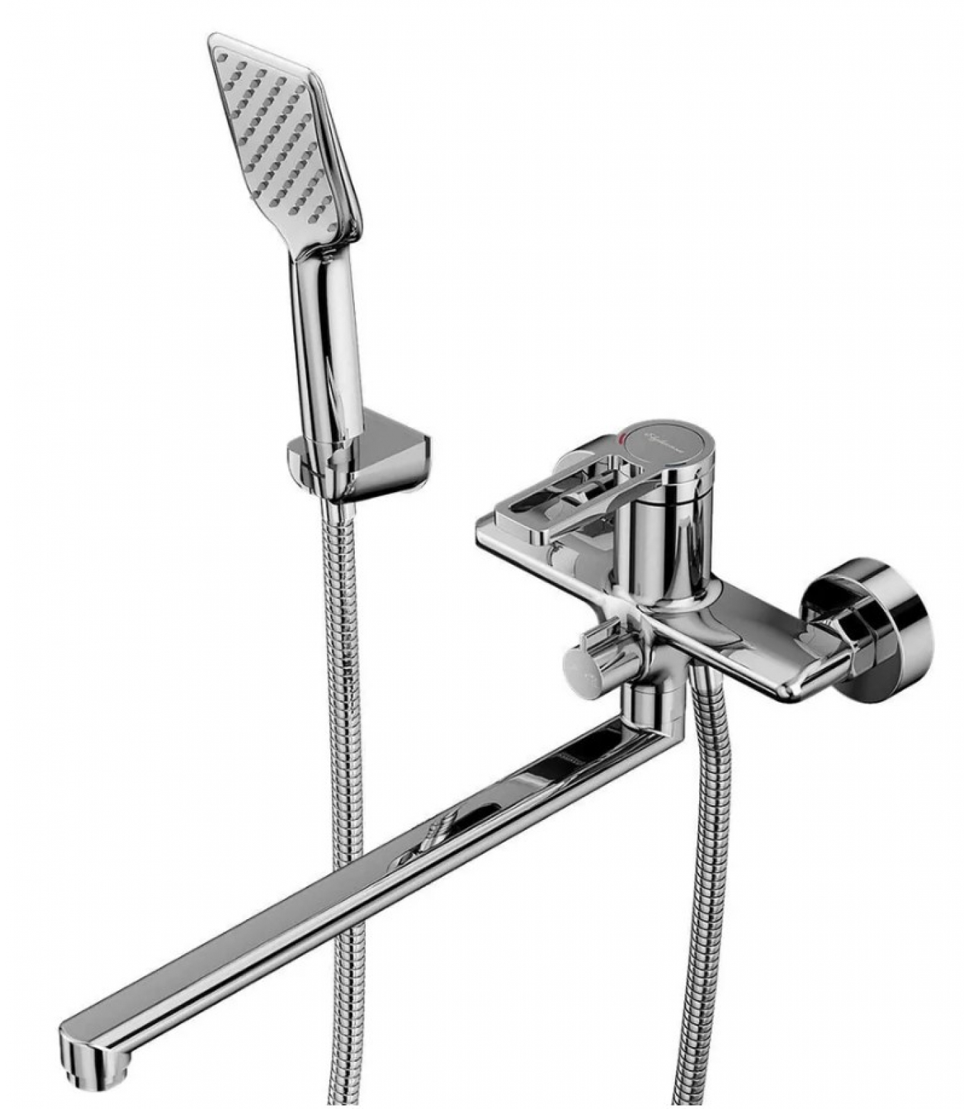 Особенности смесителя с душевой группой, длинный излив, глянцевая поверхность