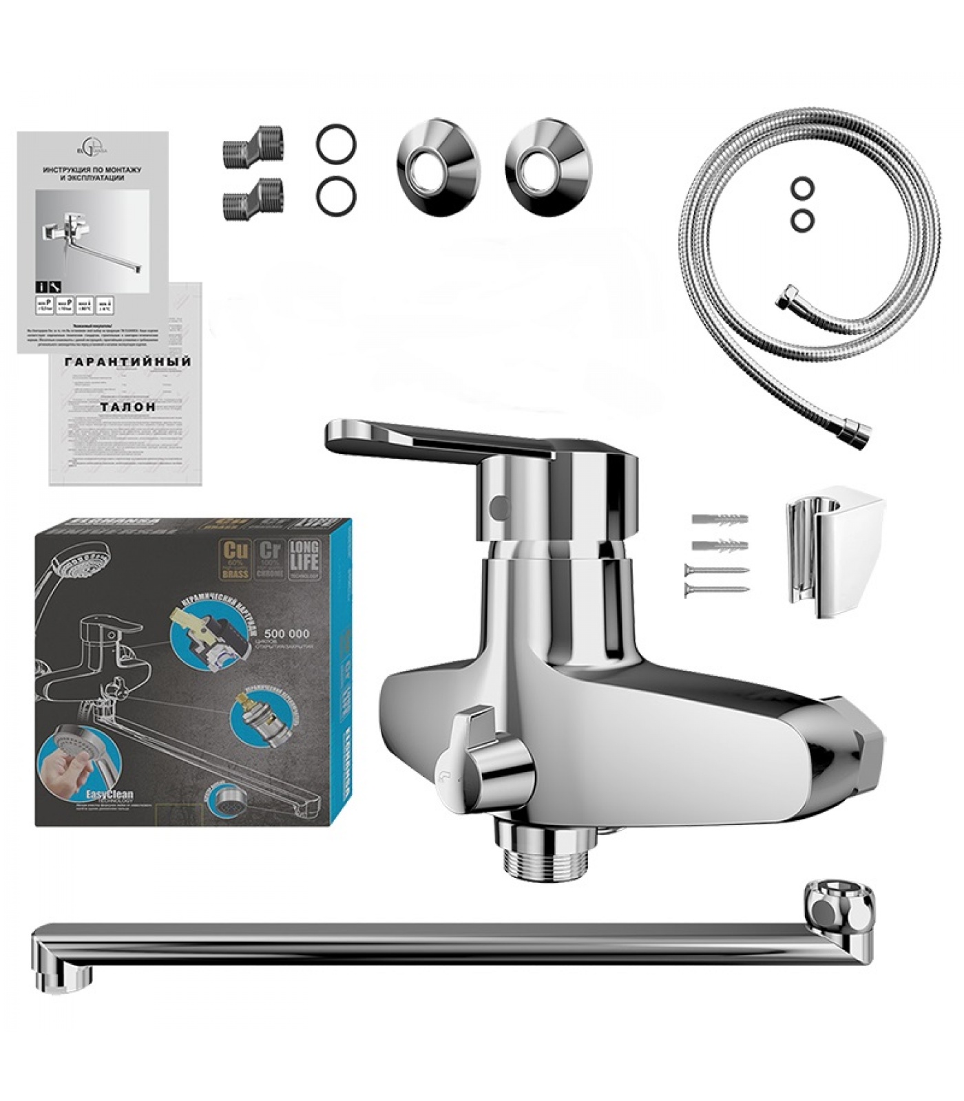 Комплектация: Смеситель с керамическим переключателем, лейка пластиковая душевая, настенный кронштейн, металлический душевой шланг 150 см, излив 37 см, эксцентрики, набор декоративных колпаков (цветная коробка).