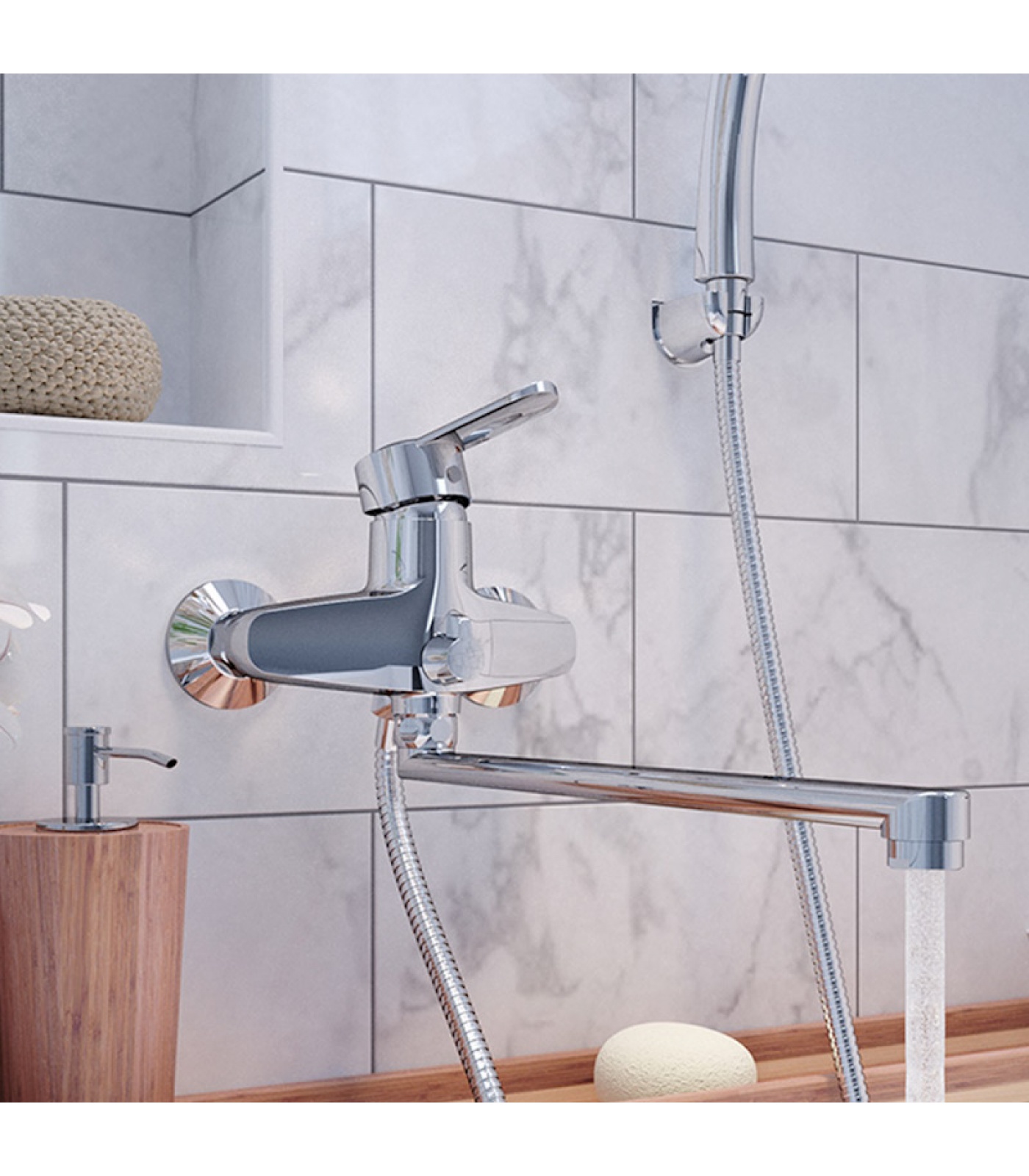 Смеситель для ванны универсальный с длинным поворотным изливом изготавливается из латуни – противостоит образованию коррозии, деформации под воздействием жесткой воды. Толщина и прочность материала гарантируют долгую службу и тихую работу смесителя (класс шумности I).