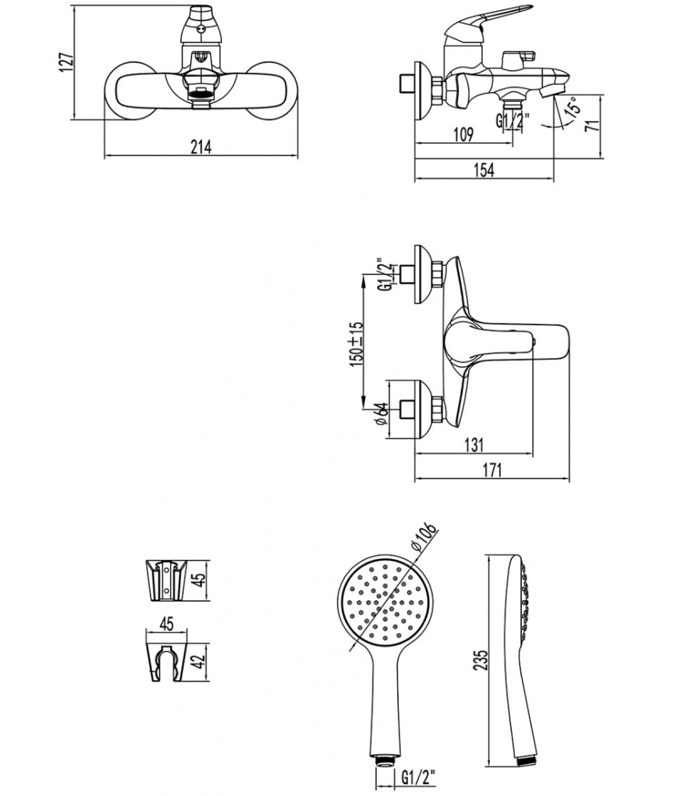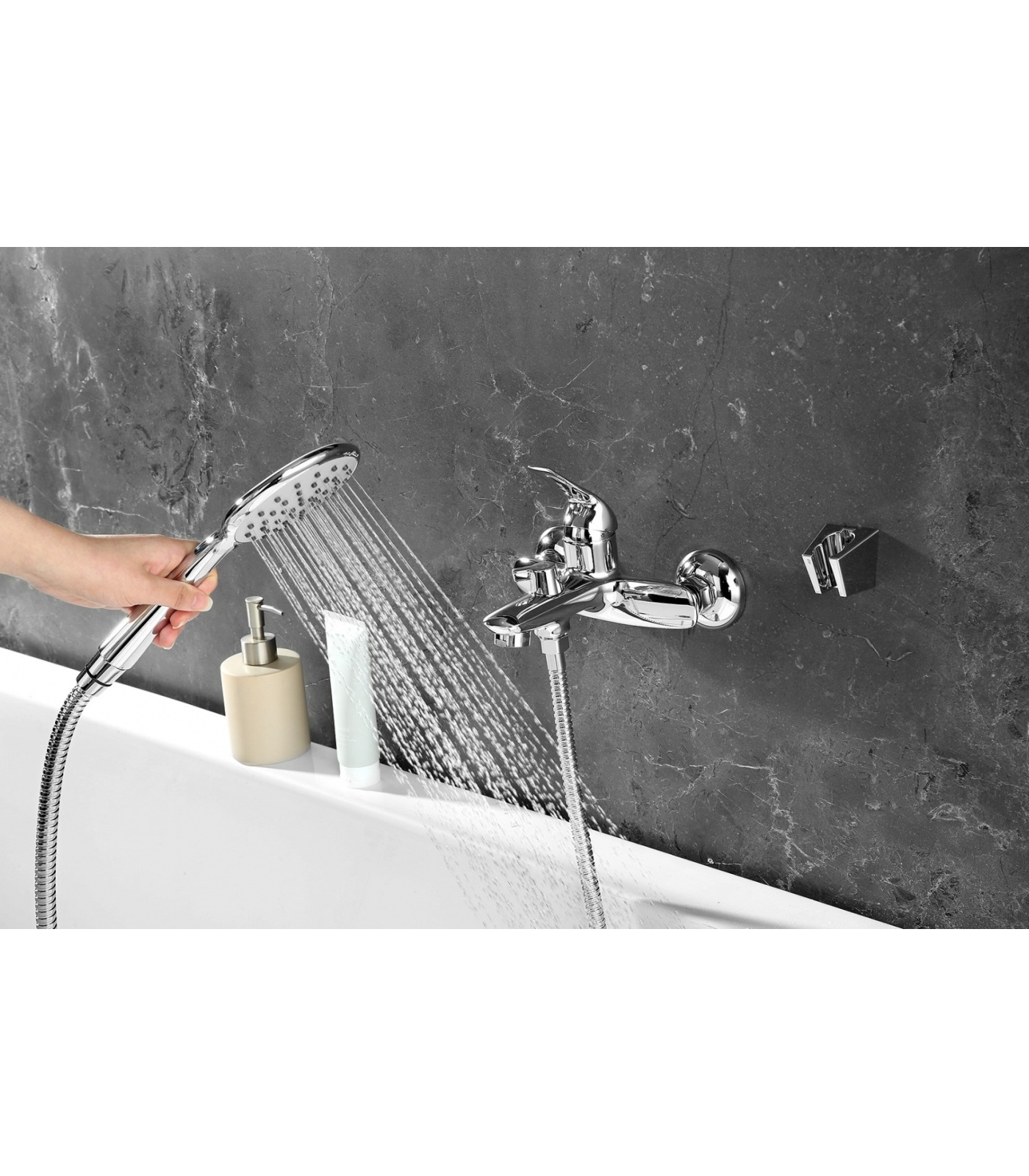 Аксессуары в комплекте: душевой шланг 1,5 м (Turn-Free), 1-функциональная лейка Ø106х235 мм, настенное фиксированное крепление