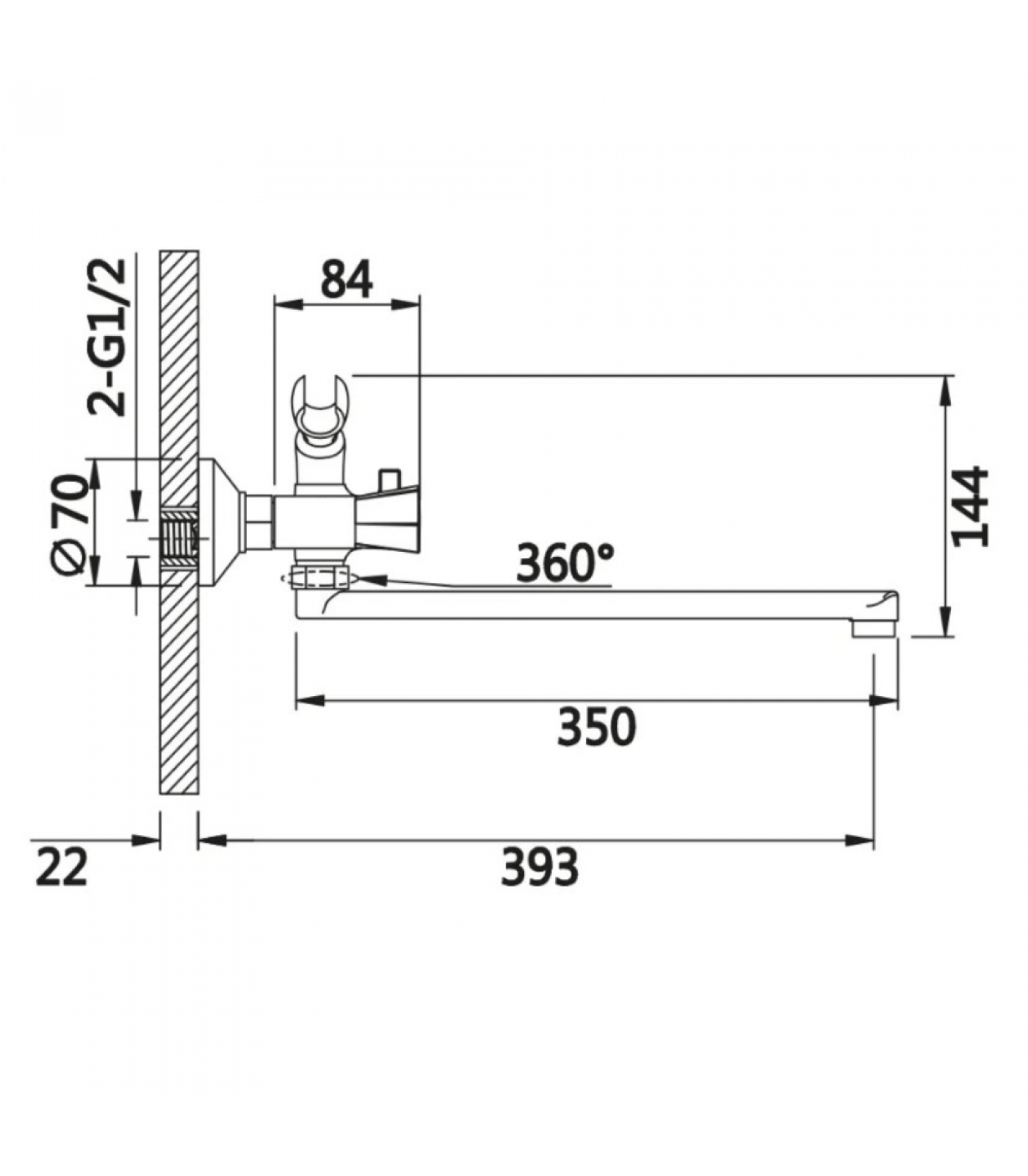 Хромовое покрытие придает смесителю современный вид и защищает его от коррозии. Смеситель устанавливается на стену при помощи стандартных крепежей. В комплекте имеется душевая насадка с держателем и шланг длиной 150 см с защитой от перекручивания.