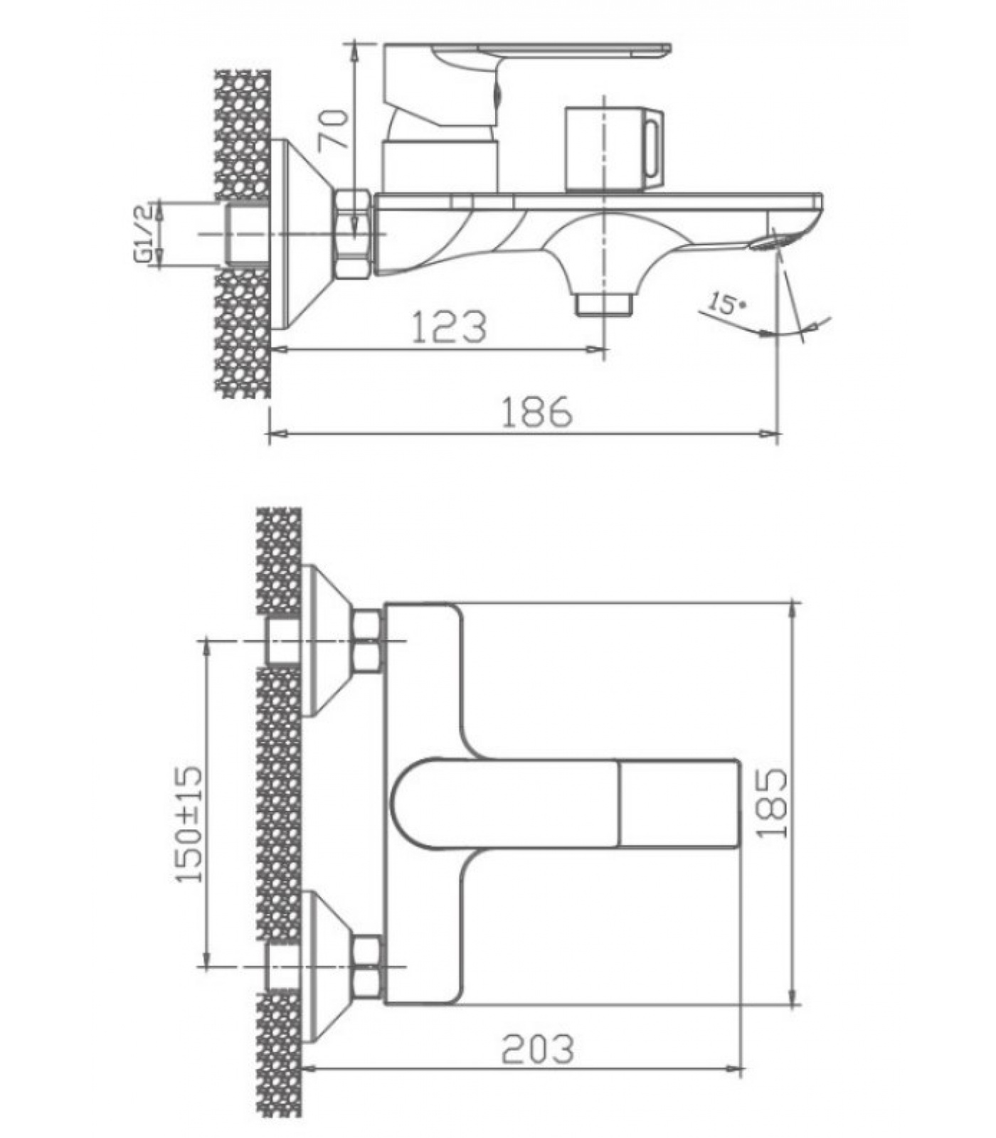 Керамический картридж 35 мм. Размер декоративных чашек 70 мм. Душевой гарнитур в комплекте. Межосевое расстояние 150 мм. Данное расстояние изменяется за счет входящих в комплект эксцентриков на 15 мм в большую или меньшую стороны.