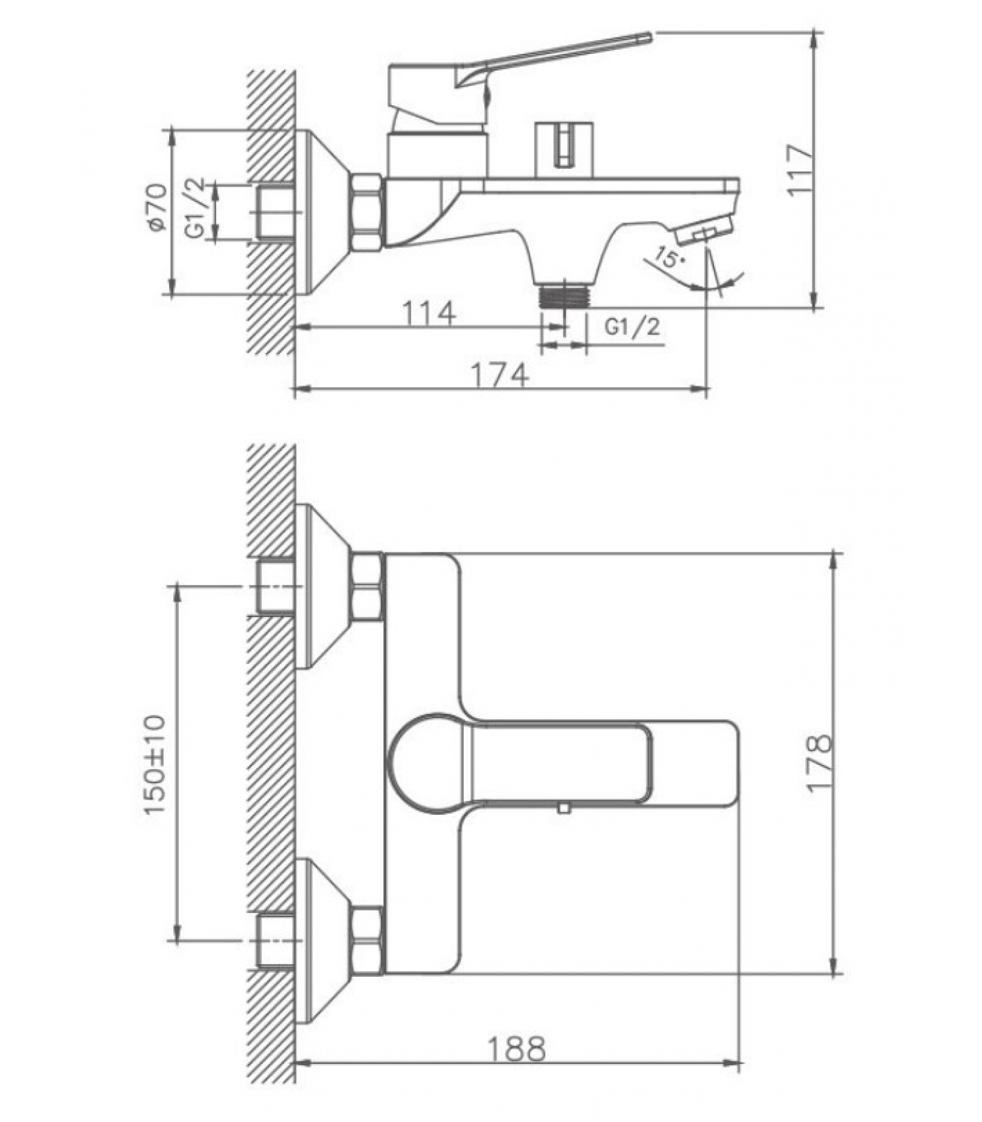 Керамический картридж 35 мм. Диаметр декоративных чашек 70 мм. Душевой гарнитур в комплекте. Межосевое расстояние 150 мм. Данное расстояние изменяется за счет входящих в комплект эксцентриков на 10 мм в большую или меньшую стороны.