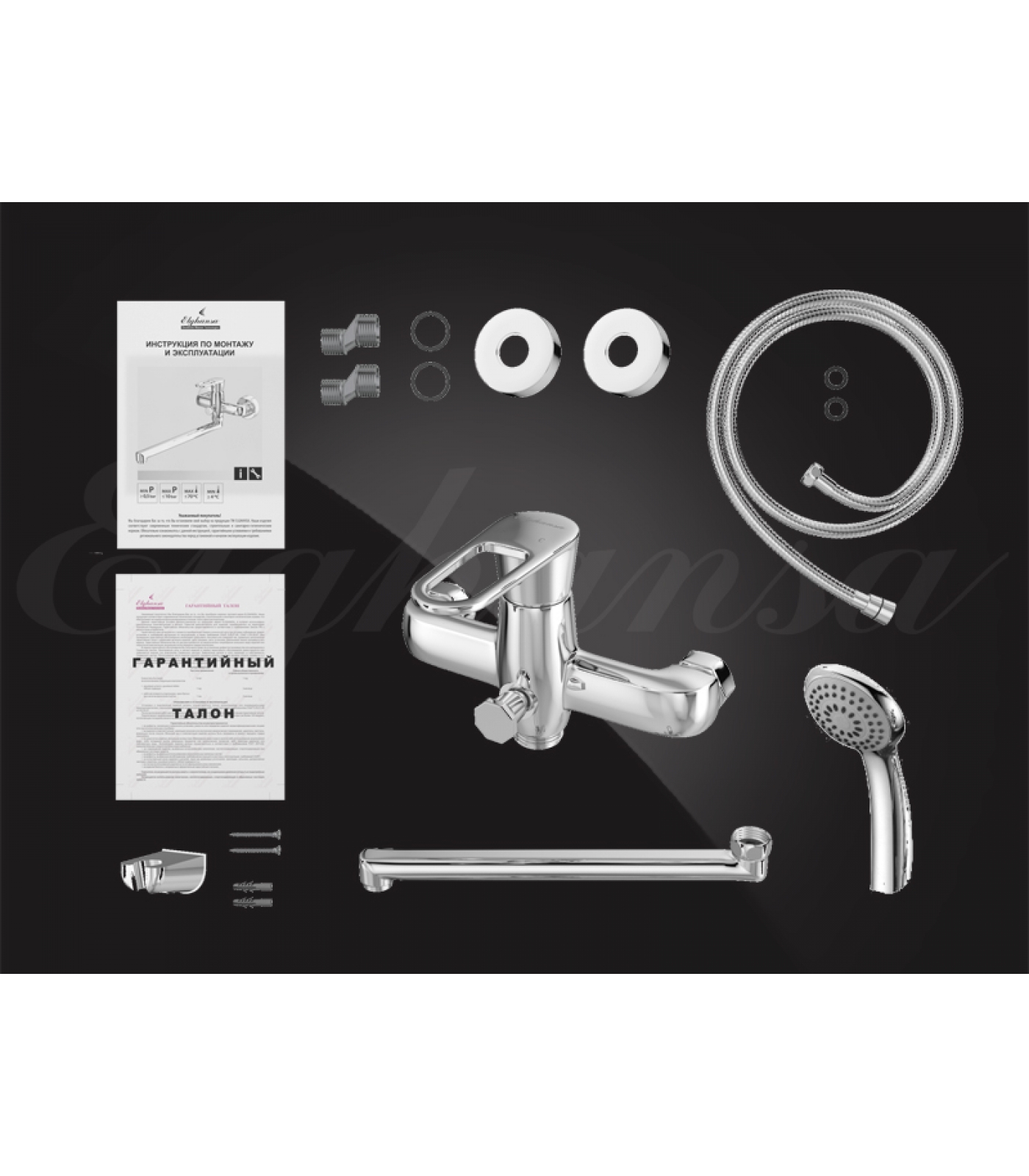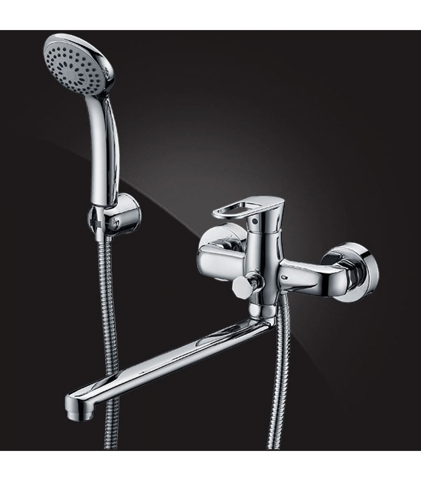 Душевой комплект включает лейку со шлангом и держателем, что позволяет пользователю настраивать поток и направление струи воды. Смеситель изготовлен из высокопрочной латуни и покрыт специальным составом, предотвращающим коррозию и износ.