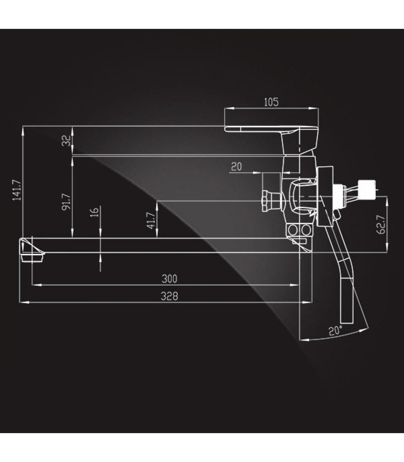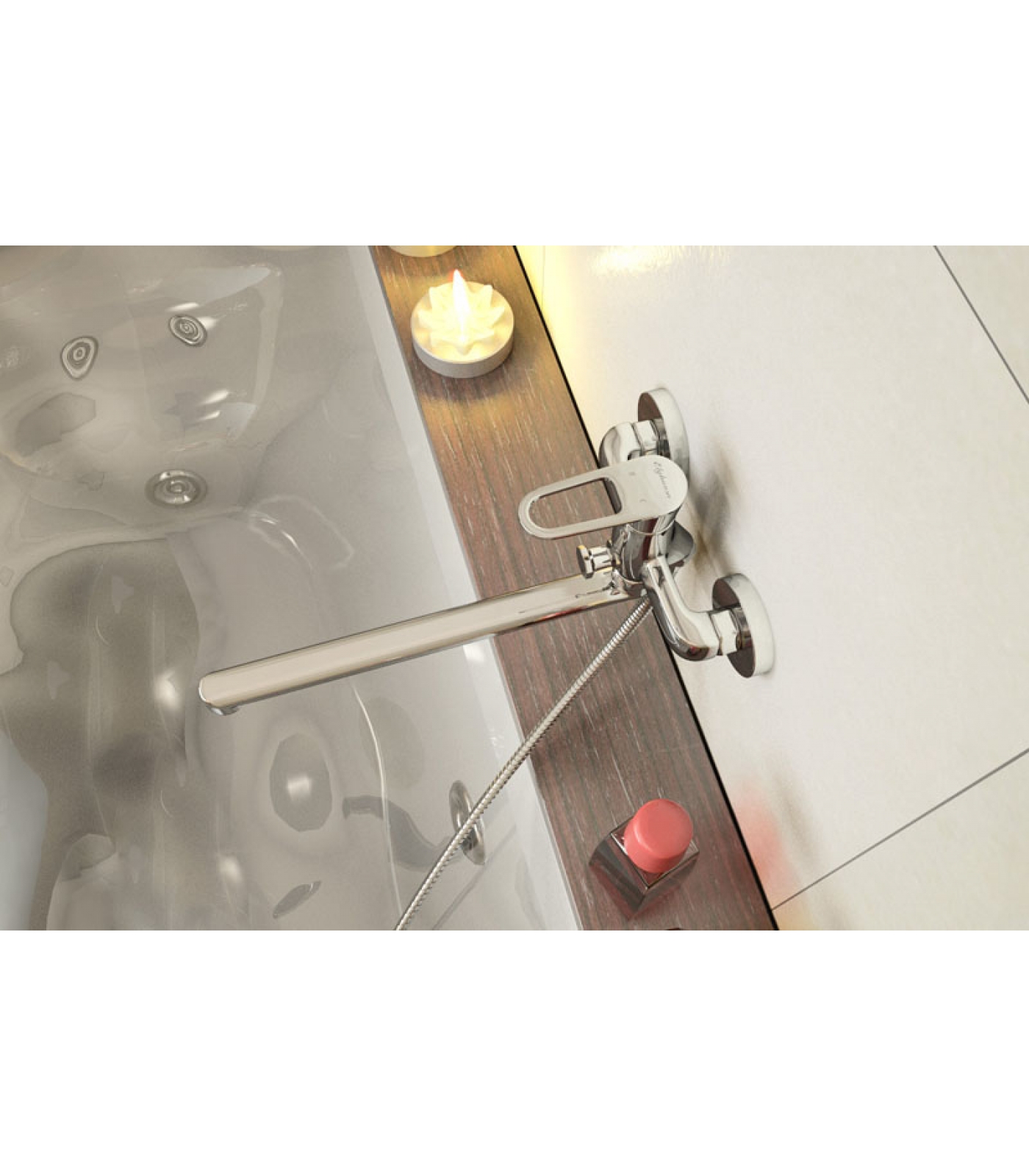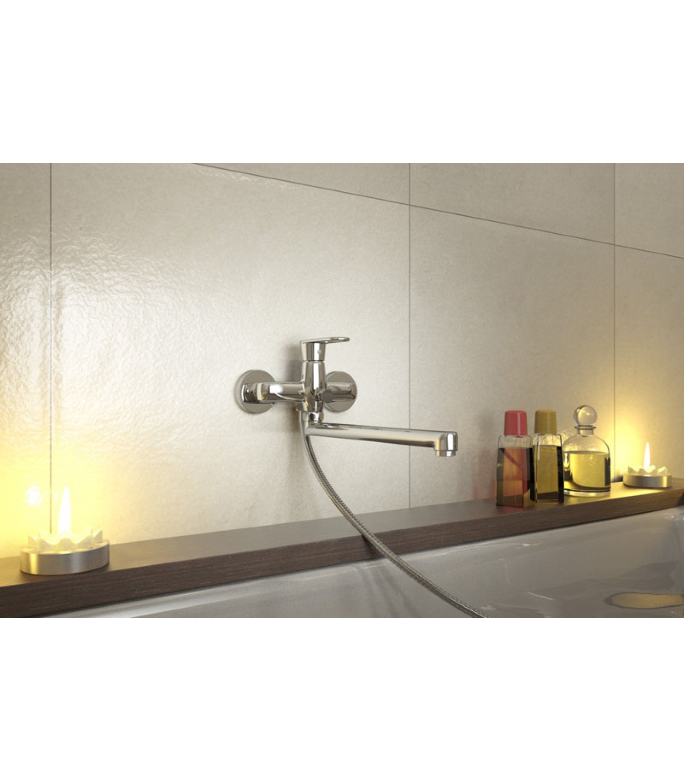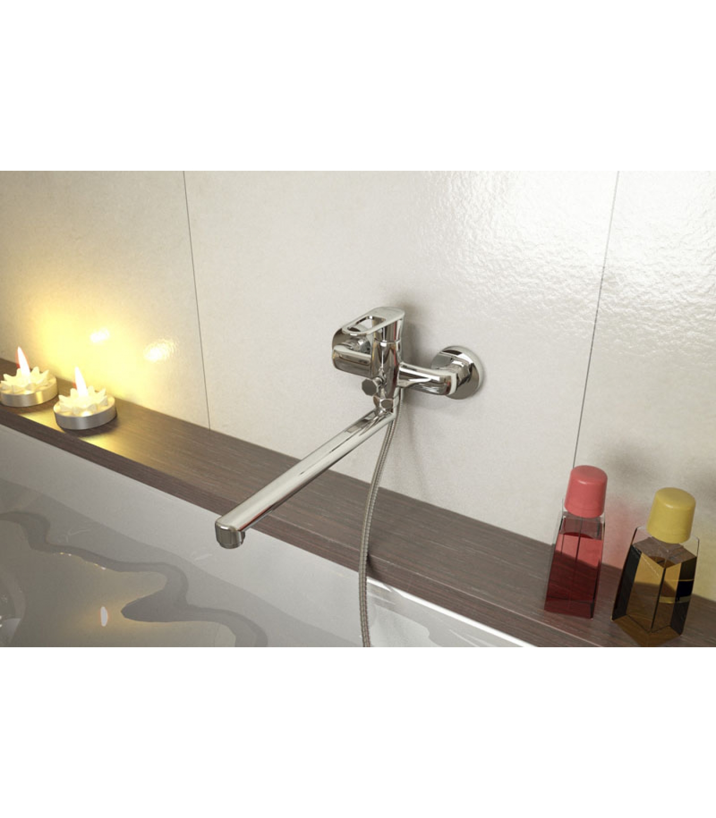 Однорычажный механизм обеспечивает плавное регулирование температуры и напора воды, что делает использование смесителя максимально удобным. Длинный излив дает возможность использовать его не только для наполнения ванны, но и для мытья раковины или посуды.