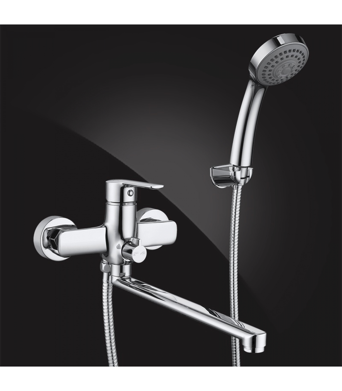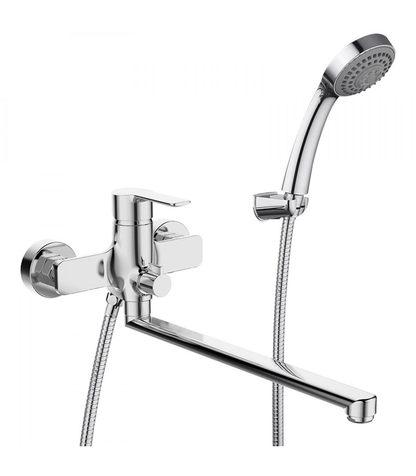 Смеситель для ванны, излив плоский 28 см, 3-х режимная душевая лейка 80 мм, металлический душевой шланг (150 см), настенный кронштейн, эксцентрики, набор декоративных колпаков.