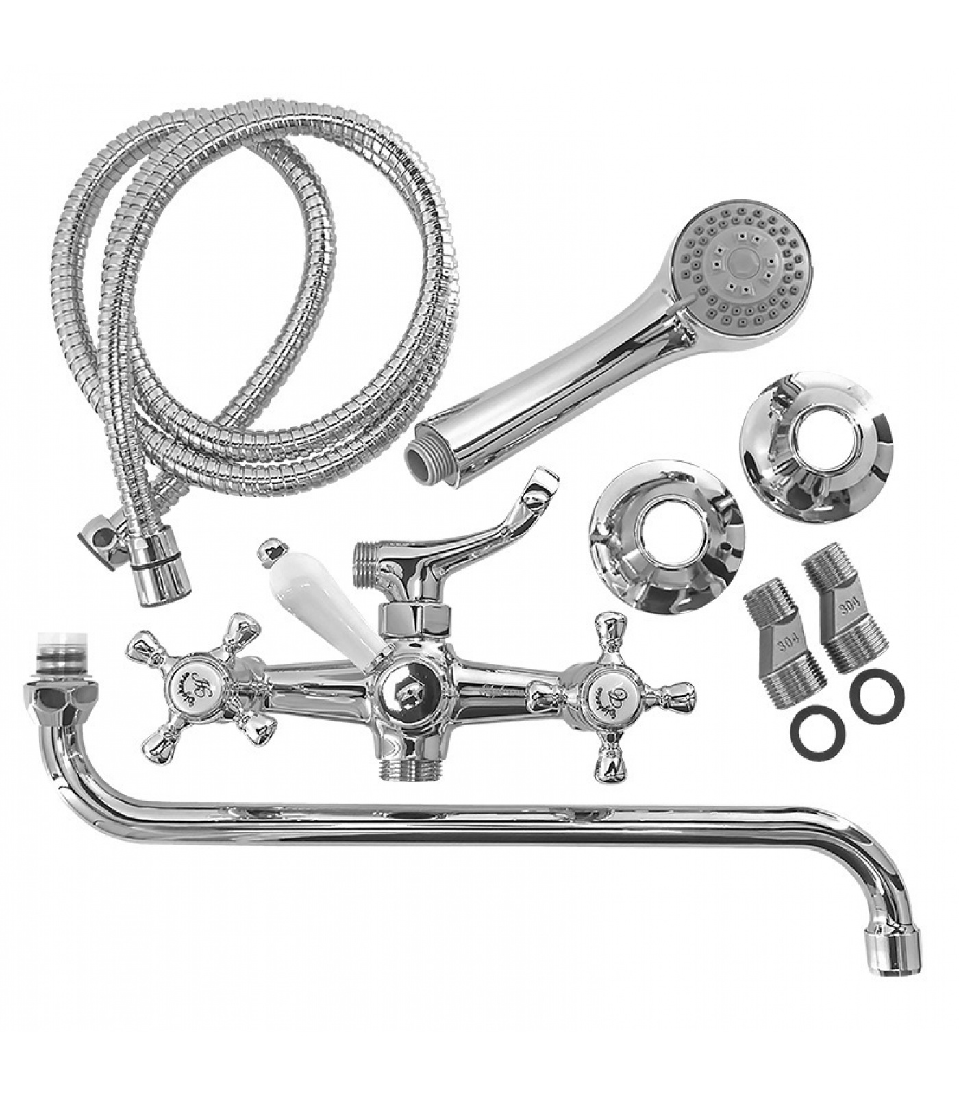 Смеситель с керамическим переключателем, пластиковая душевая лейка 60 мм, металлический душевой шланг 150 см, трубчатый излив D=18 мм длина 33 см, эксцентрики, набор декоративных колпаков.