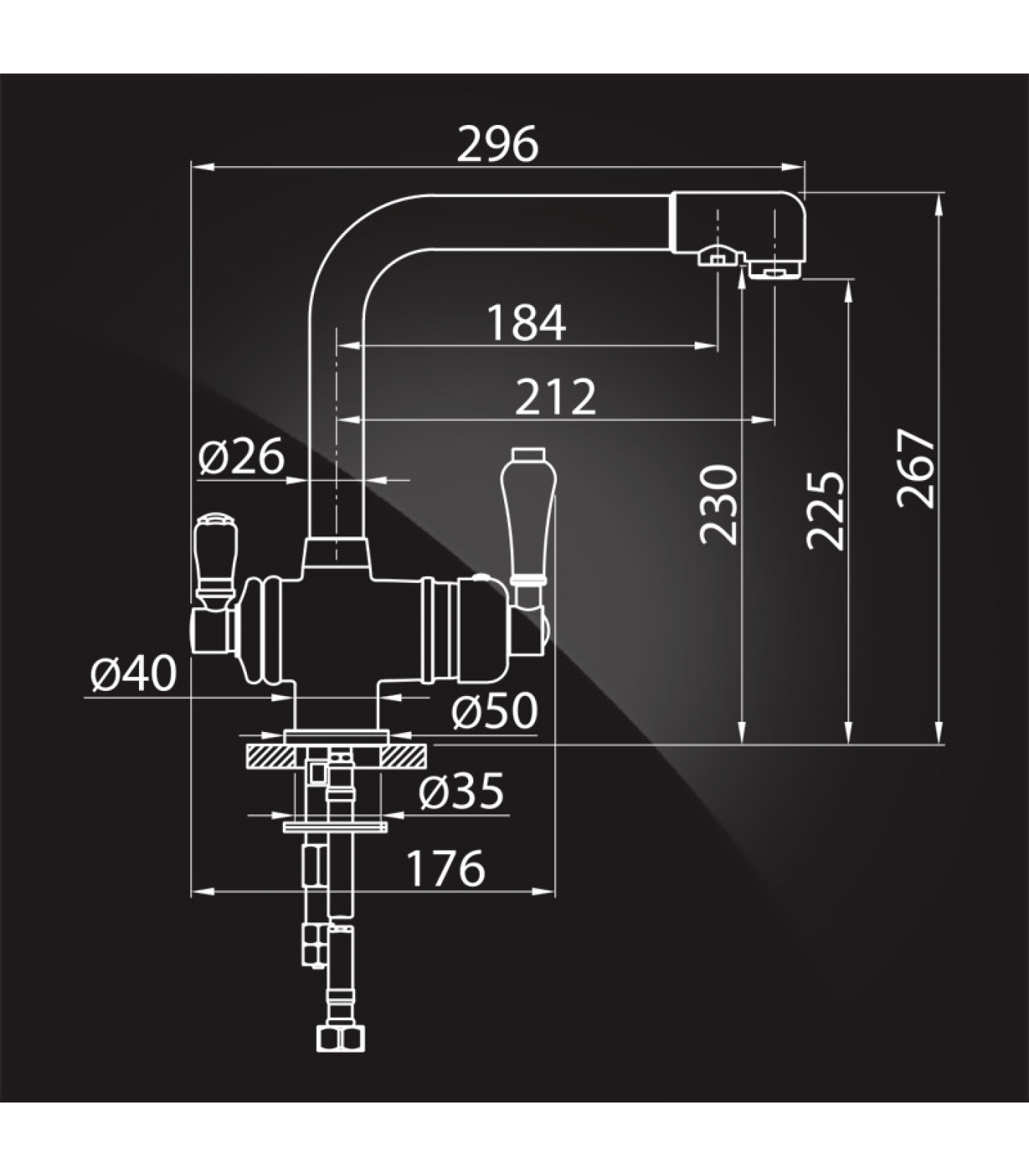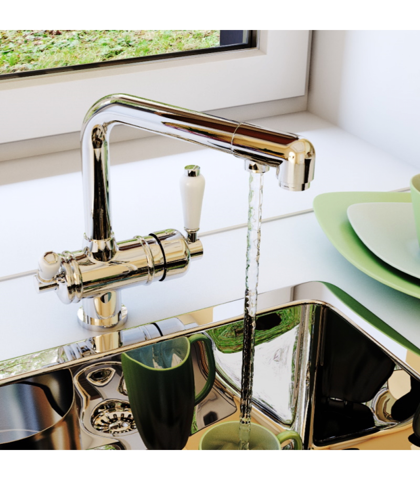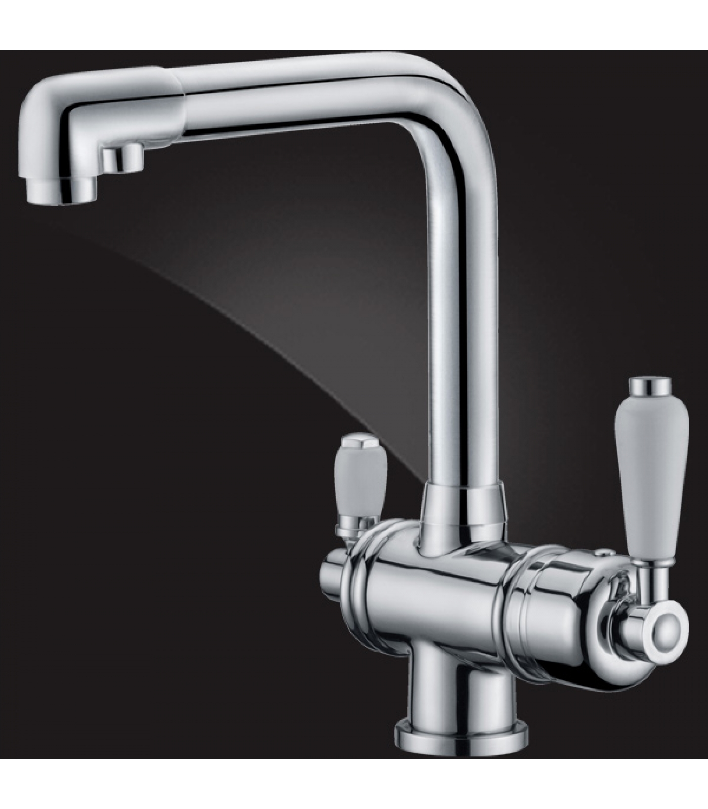 Смеситель имеет два рычага – для воды из фильтра и водопроводной, а также две водоизливных трубки для разделения очищенной и не очищенной воды.