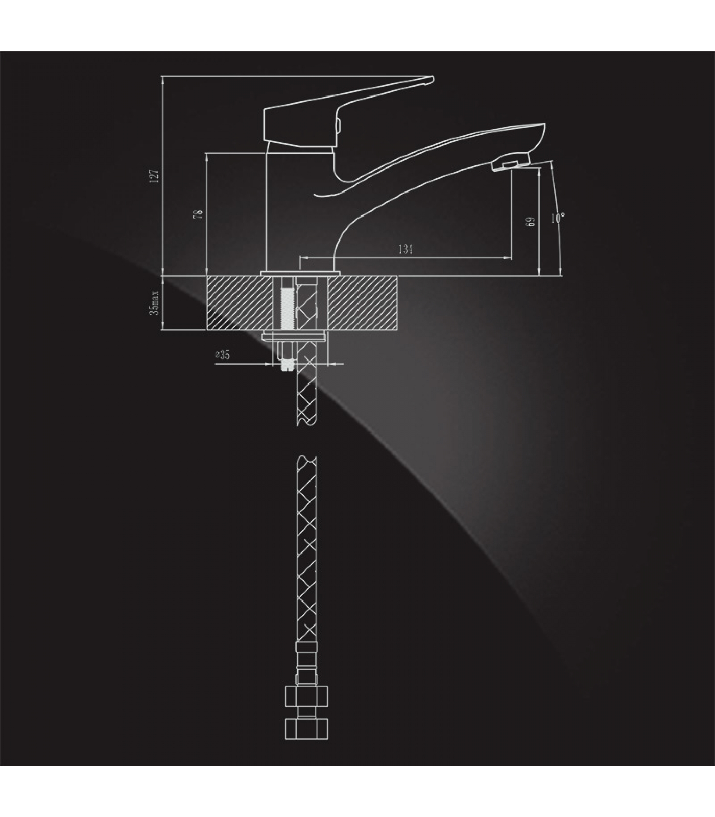 Комплектация: Смеситель, набор крепежа для установки смесителя, 2 гибких шланга для подвода воды.