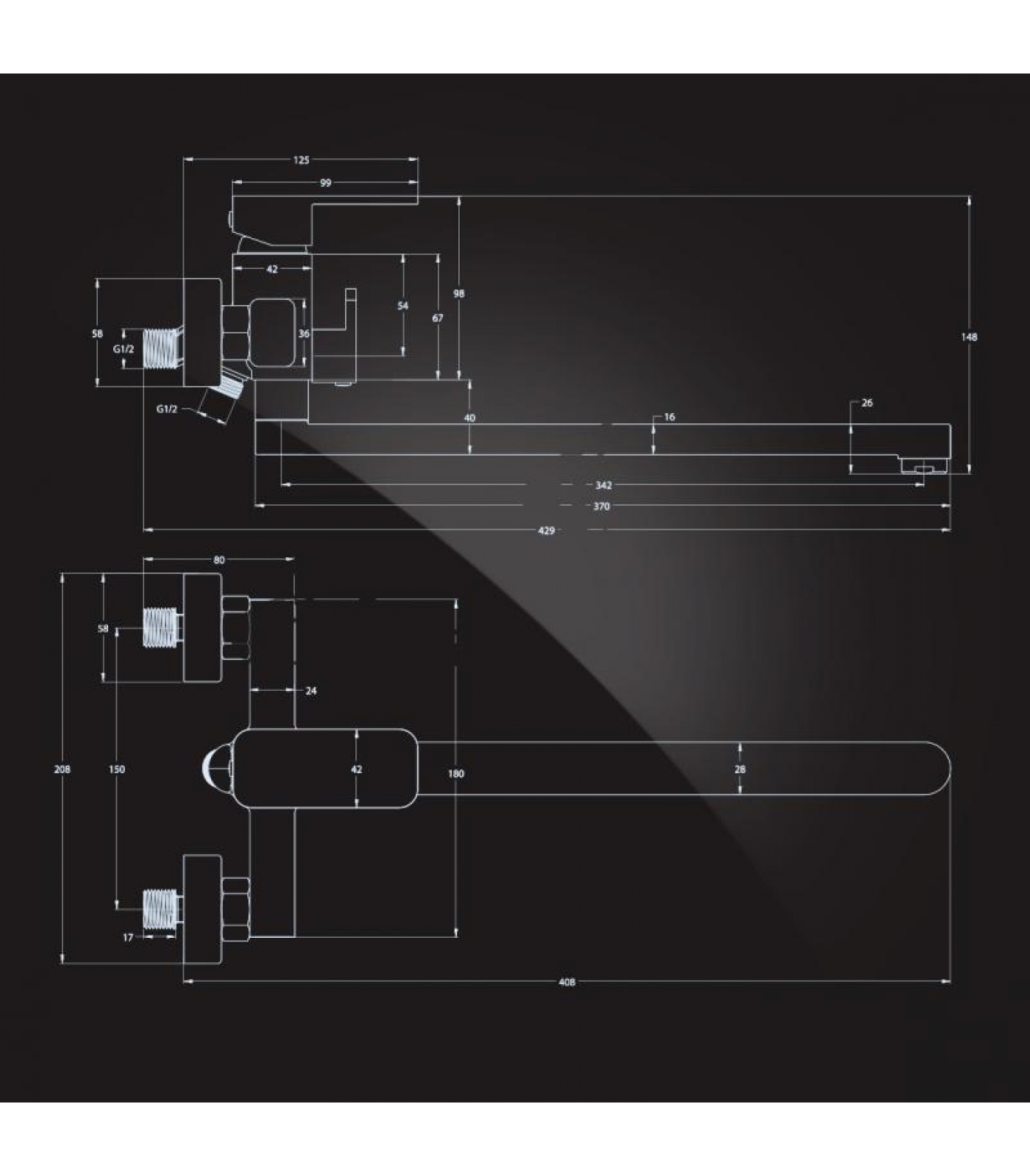 Комплектация: Смеситель, излив плоский 35 см, настенный кронштейн, пластиковая душевая лейка, душевой шланг 150 см, эксцентрики, набор декоративных колпаков.