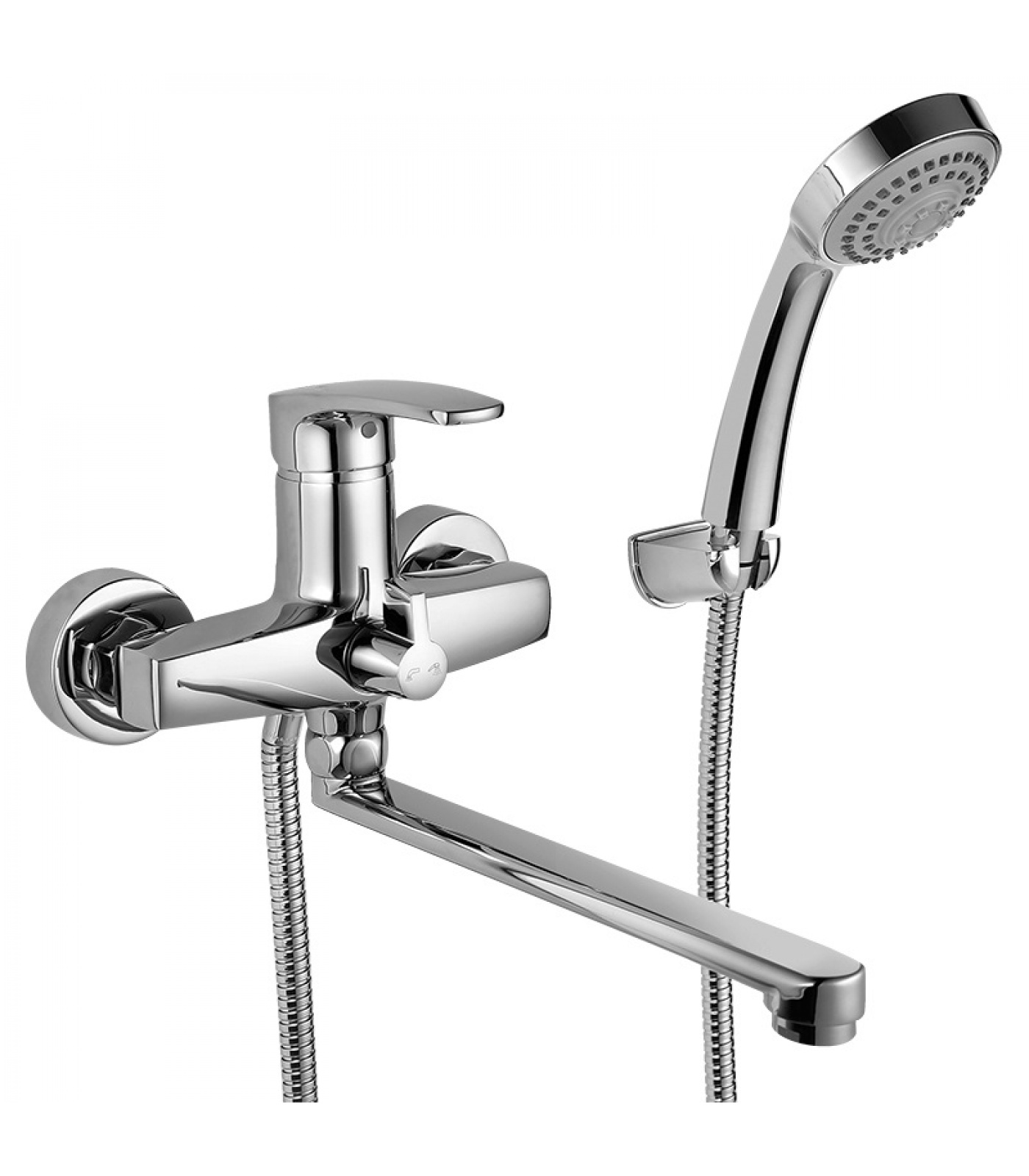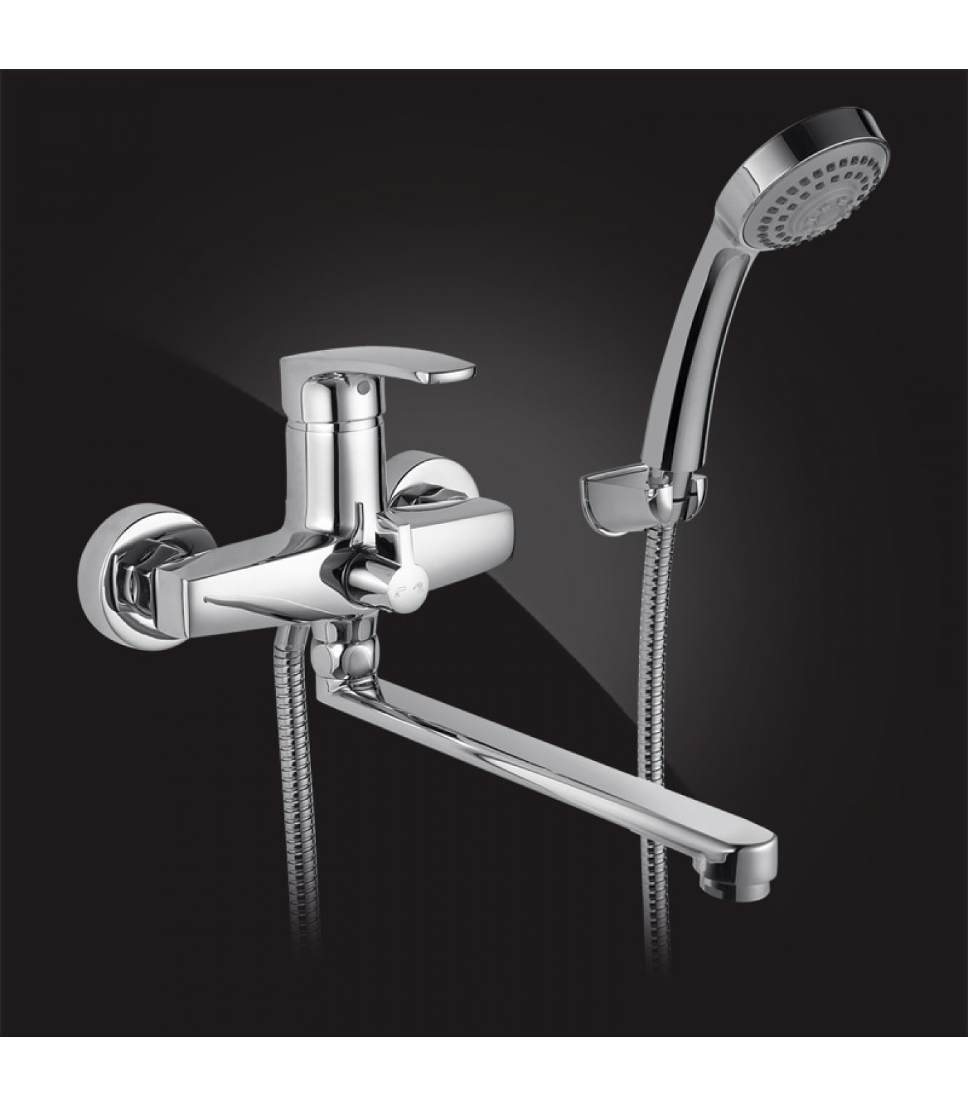 Комплектация: Смеситель с керамическим переключателем, лейка пластиковая душевая, настенный кронштейн, металлический душевой шланг 150 см, излив 20 см, эксцентрики, набор декоративных колпаков.