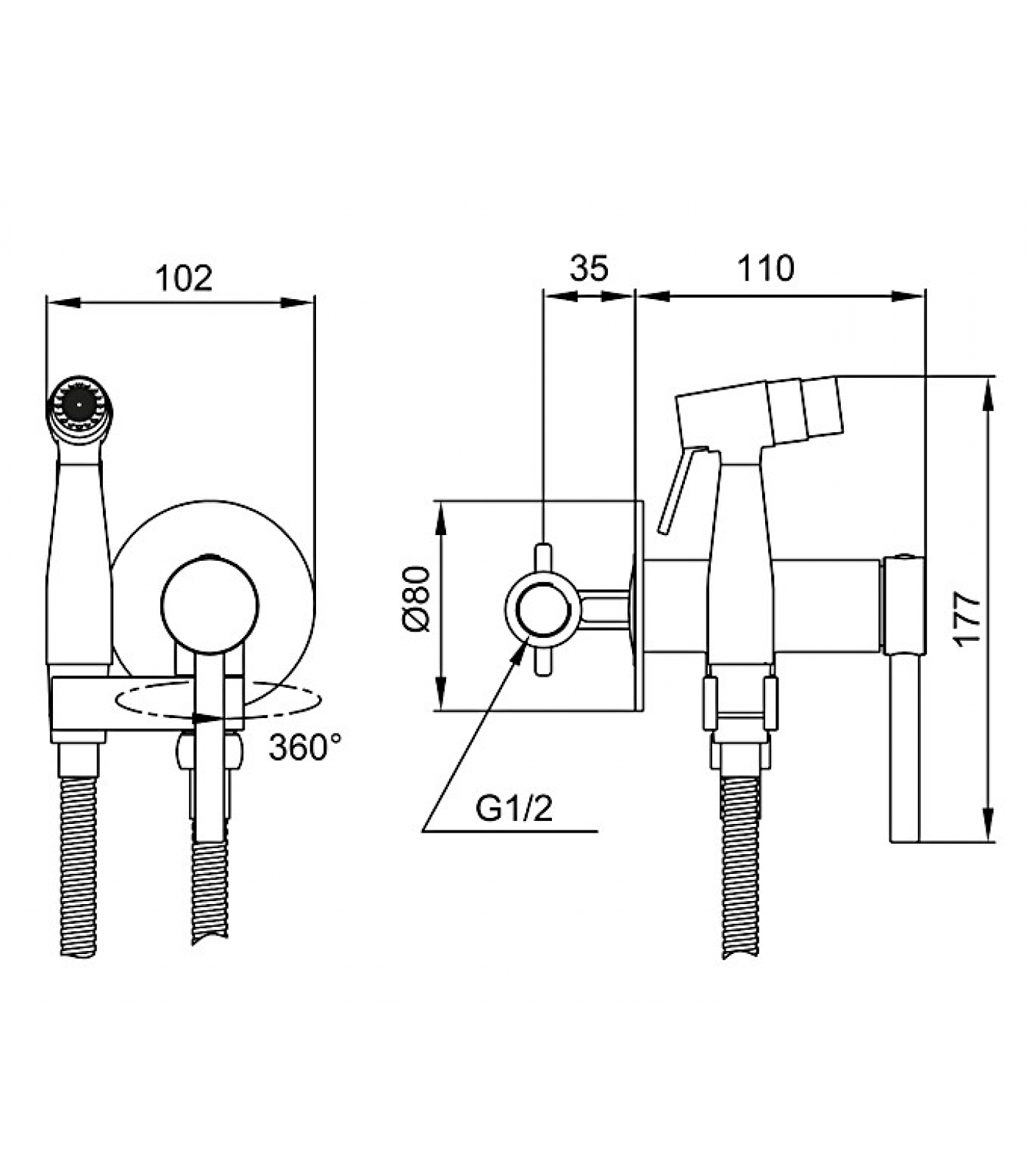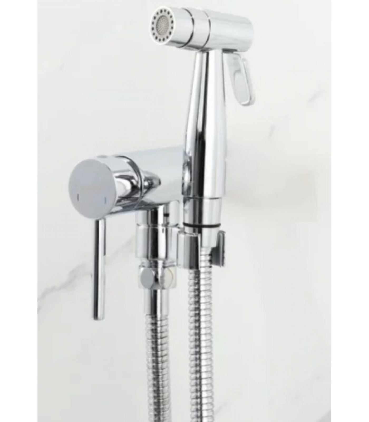 Комплектация: гигиеническая лейка, держатель лейки, душевой шланг, наружная часть смесителя, смеситель