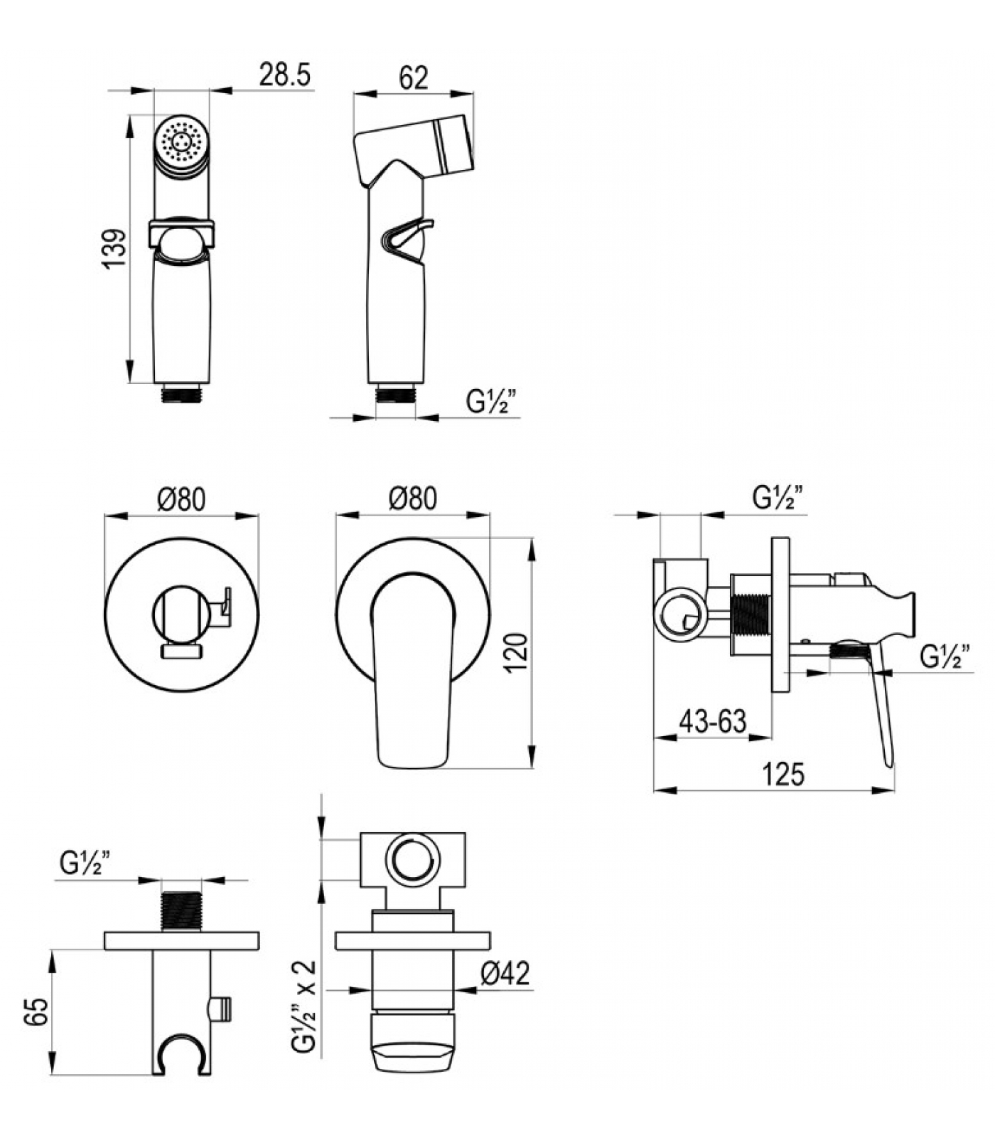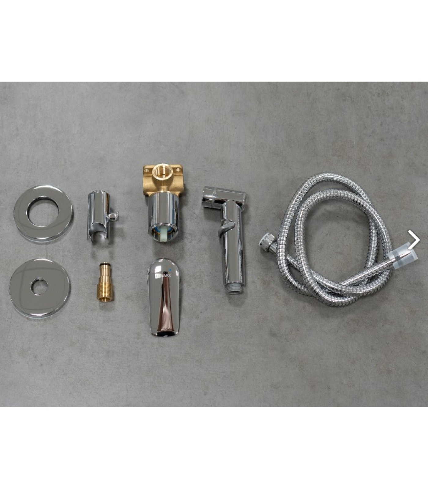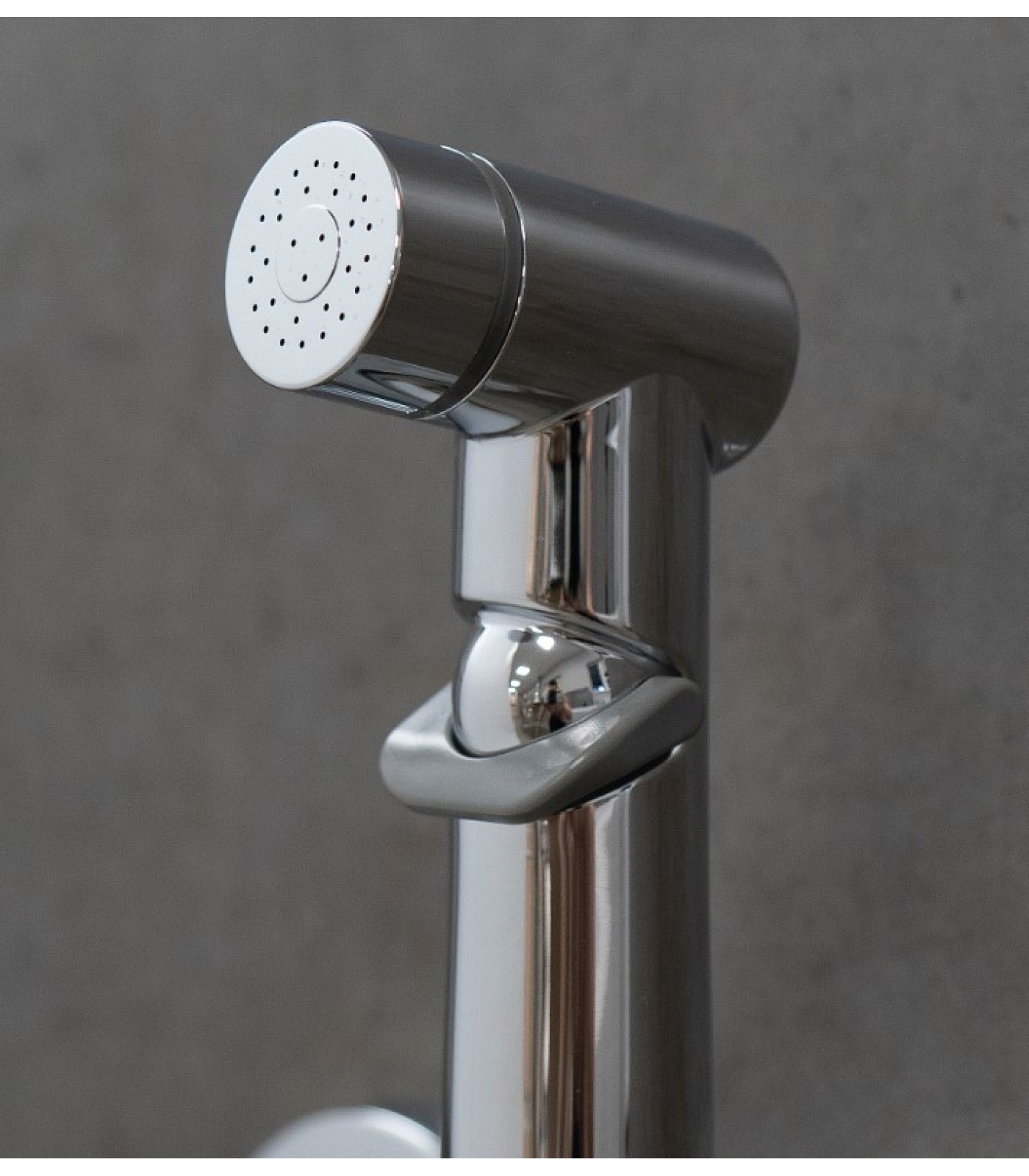 Аксессуары в комплекте: лейка гигиенического душа с регулятором напора воды, подключение для душевого шланга с креплением для лейки, душевой шланг 1,2 м