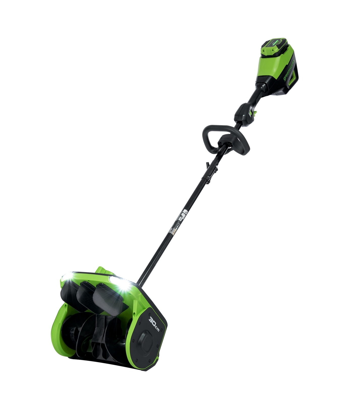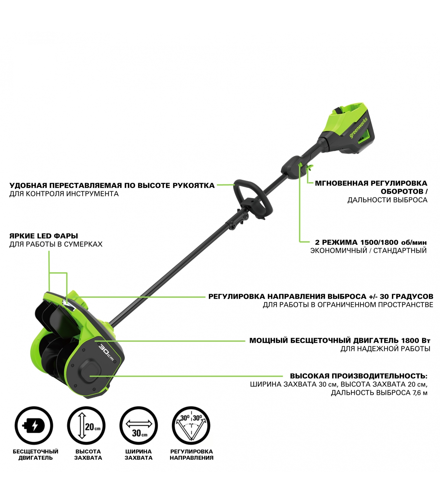 Комплект: Снегоуборщик аккумуляторный Greenworks Арт. 2603207UG, 60V, 30 см, с регулируемым направлением выброса, бесщеточный, c 1хАКБ 5Ач и ЗУ.