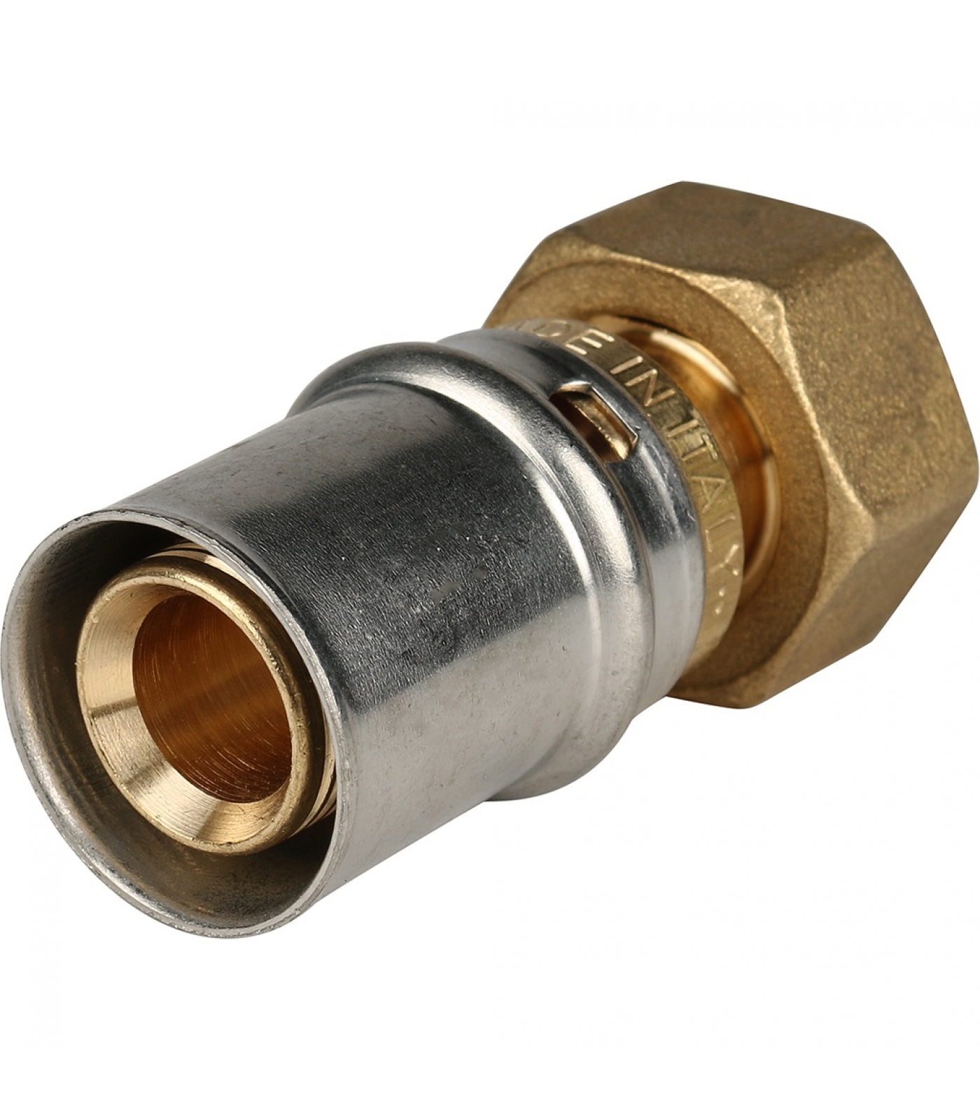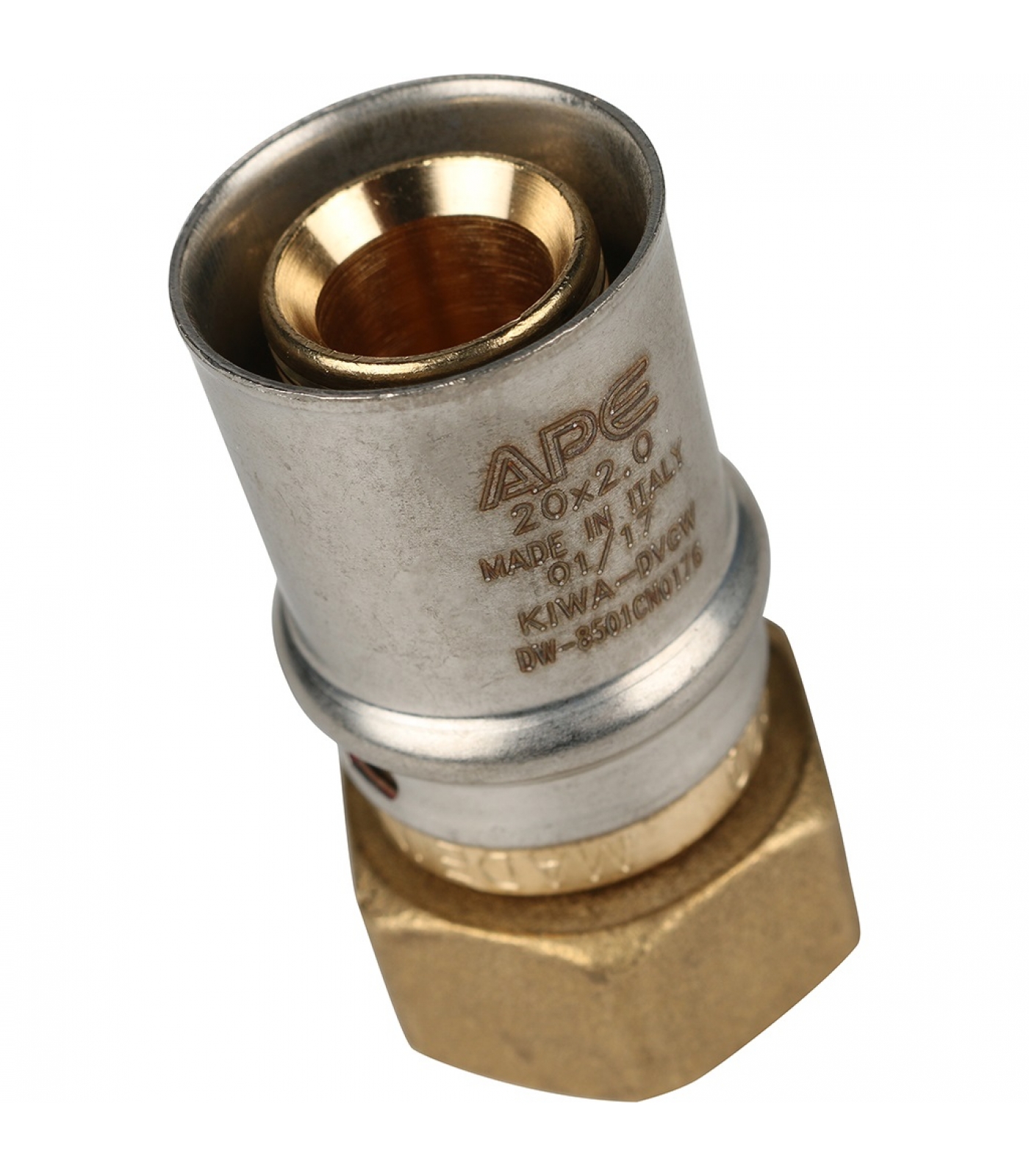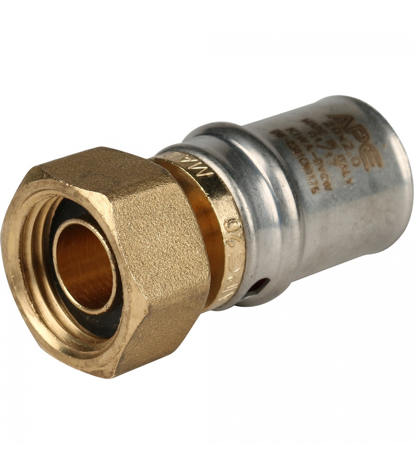 Хвостовик корпуса под пресс оснащён эластичными уплотнительными кольцами, шайбой и обжимной гильзой вставляется в присоединяемую металлополимерную трубу. Гильза обжимается на хвостовике поверх трубы с помощью специального инструмента, образуя неразборное герметичное соединение фитинга с трубой.