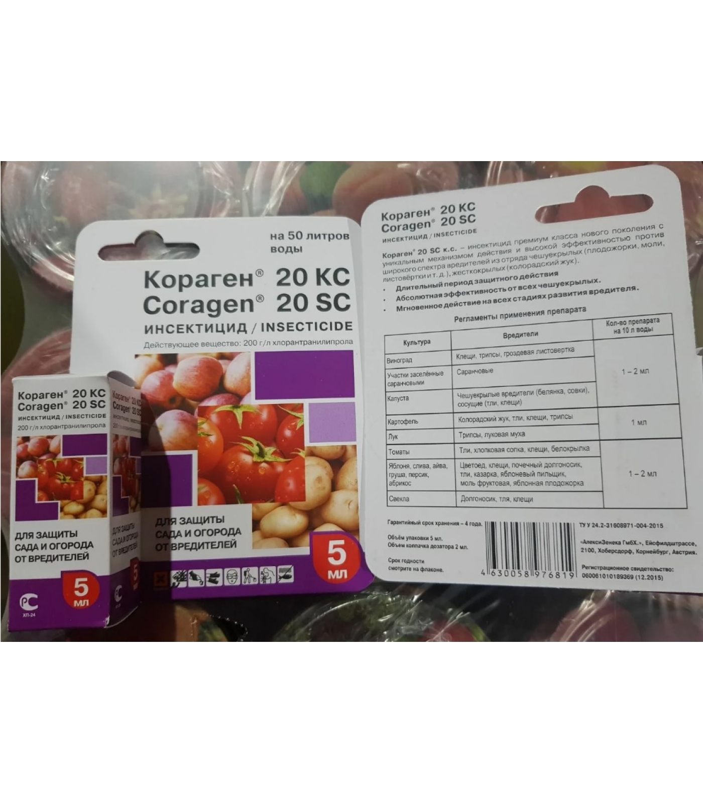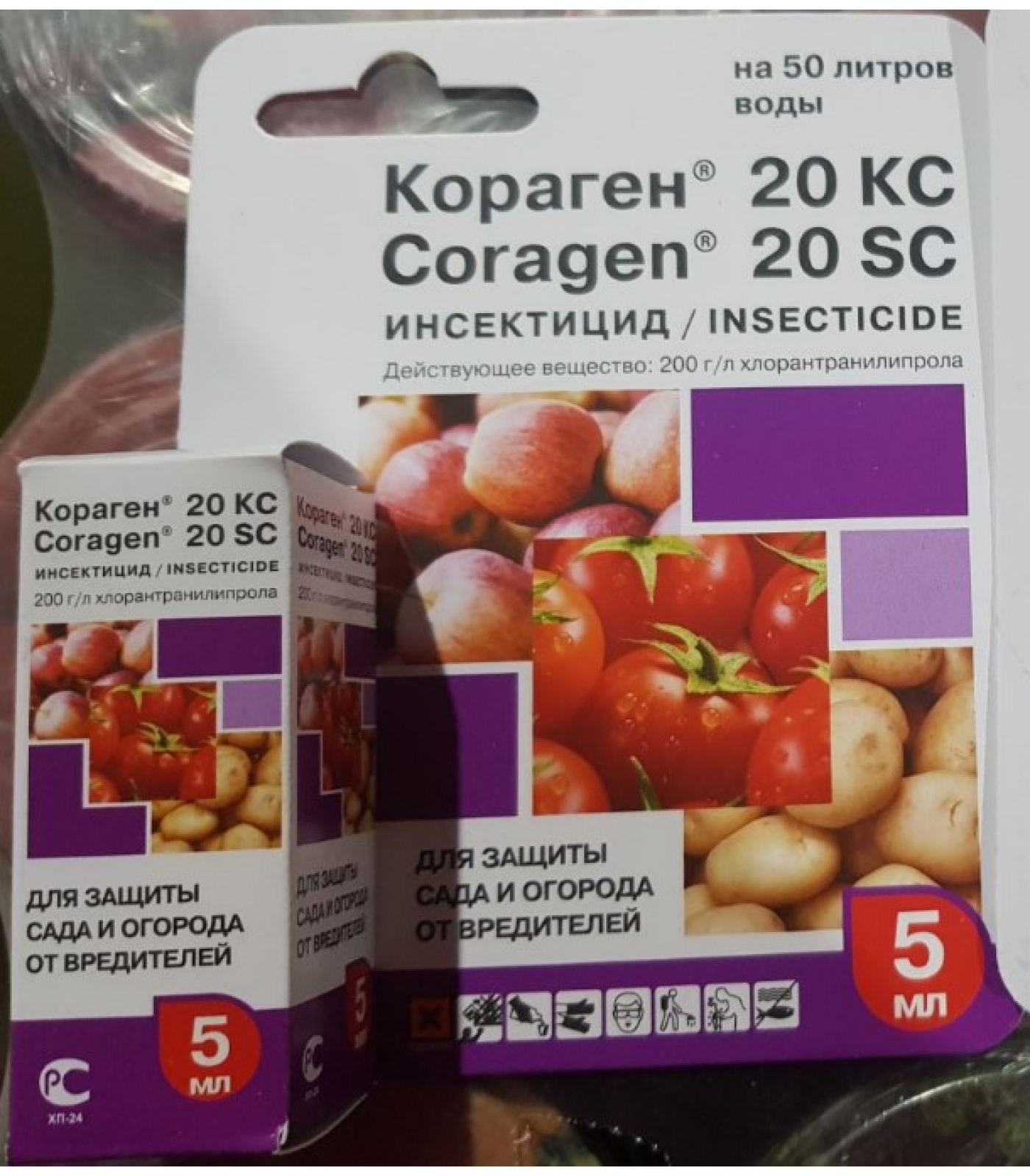 Кораген 20 КС -инсектицид премиум классанового поколения с уникальным механизмом действия и высокой эффективностью против широкого спектра вредителей из отдяда чешуекрылых (плодожорки, моли, листовертки и т.п.), жесткокрылых (колорадский жук)
