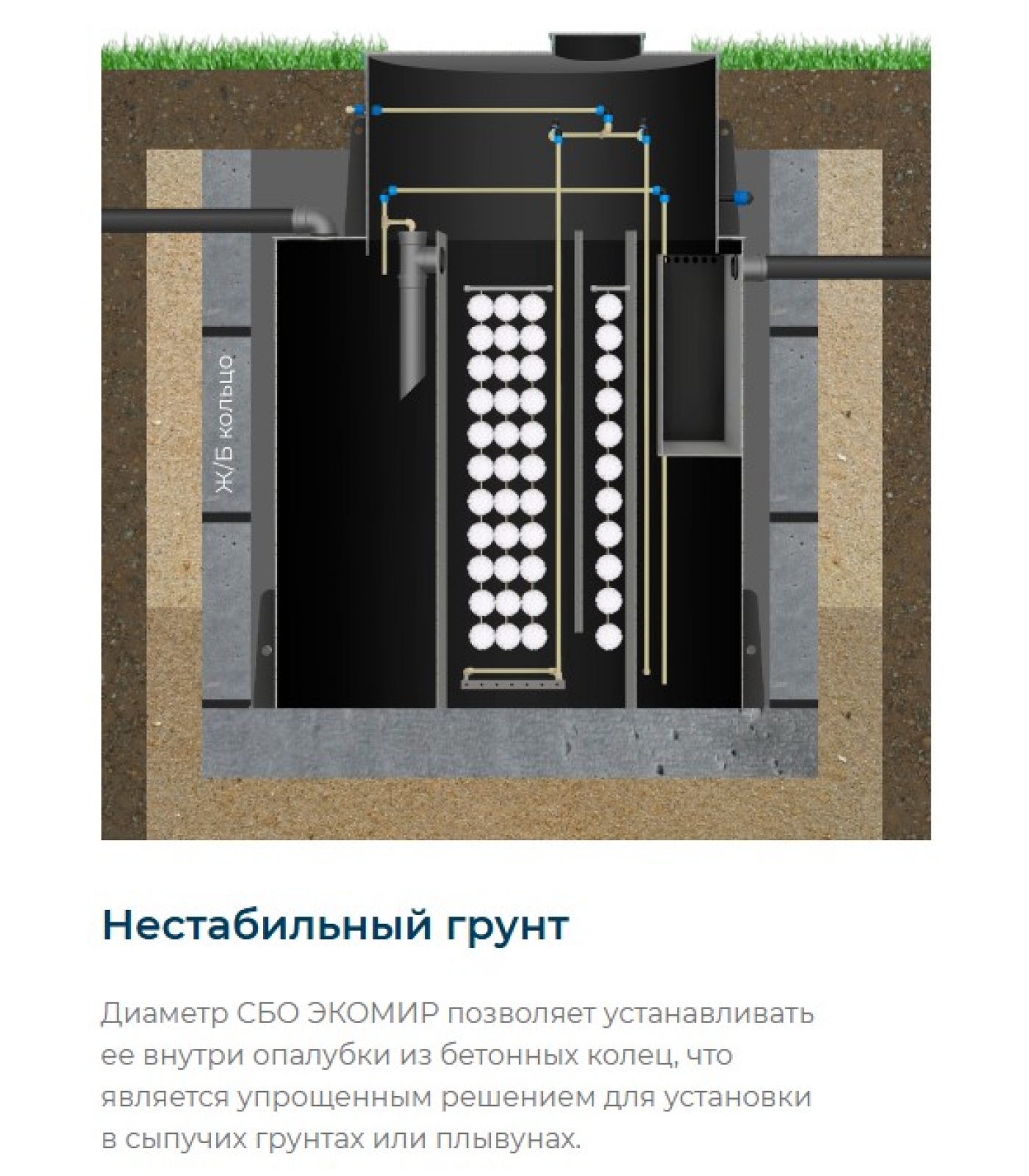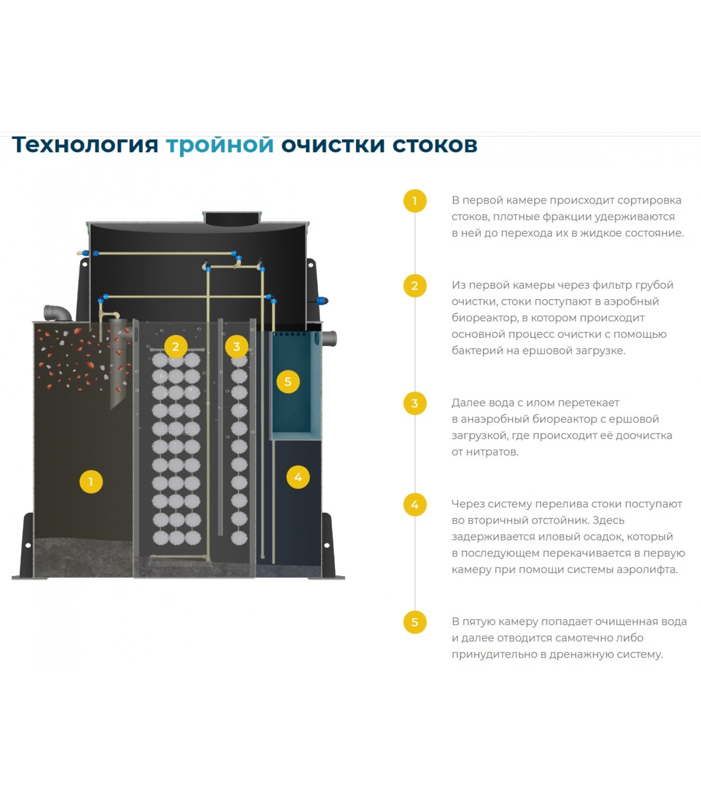 В станции реализуется экологически чистая технология глубокой биологической очистки сточных вод активным илом и микроорганизмами, действующими в аэробных и анаэробных условиях. В станции нет узлов, подверженных коррозии или гниению, требующих последующей замены.