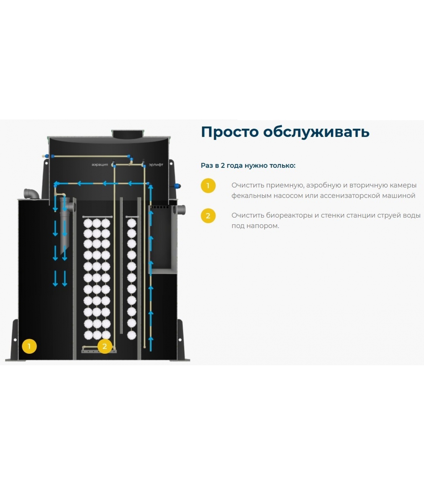 Биологическая очистка происходит без использования расходных биологических и химических компонентов. Применение станции, как правило, обусловлено отсутствием центральной системы канализации, однако станция может быть использована параллельно или попеременно с ней.