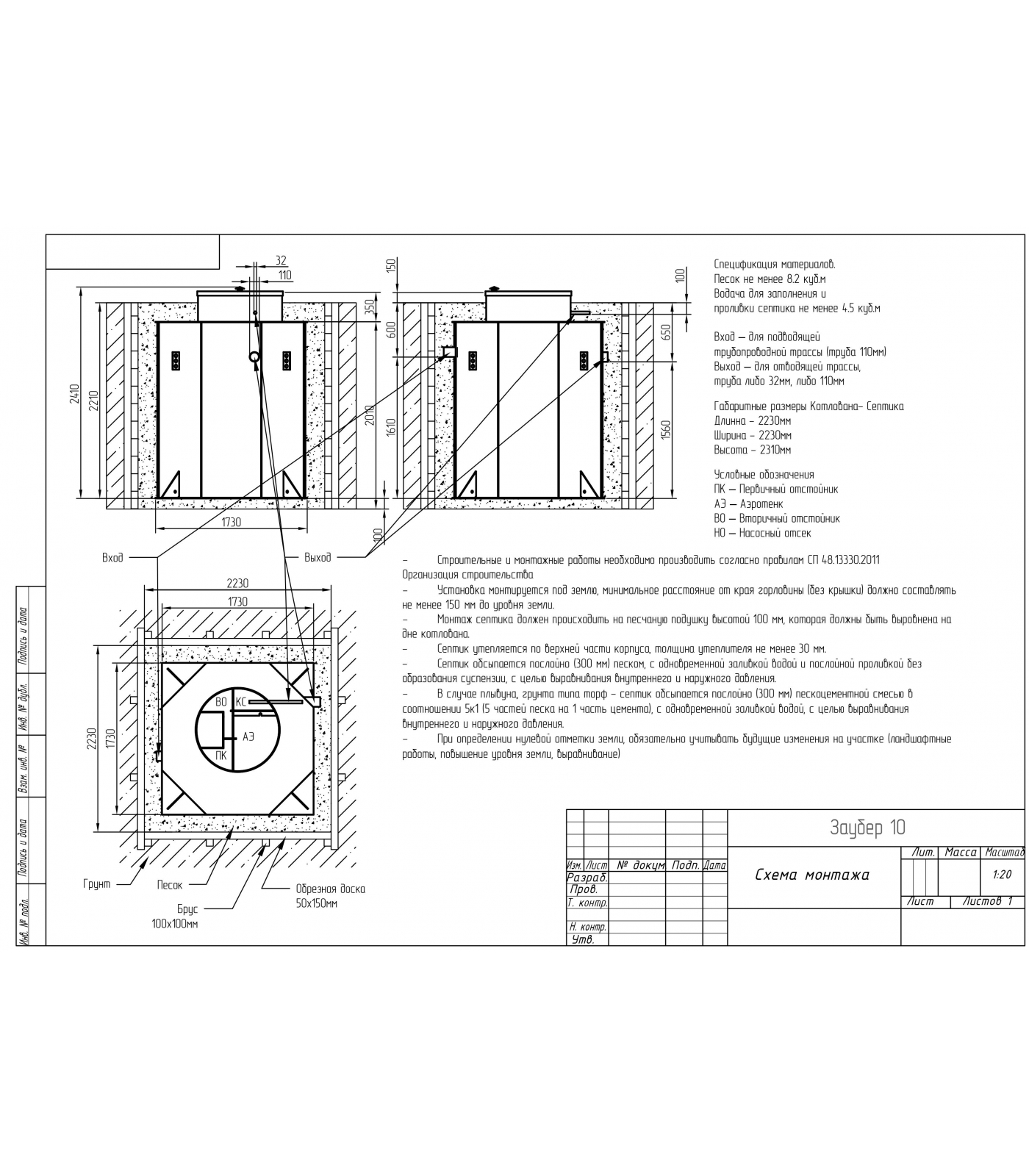 Станция глубокой очистки Заубер изготовлена из листового европейского полипропилена в вертикальном круглом корпусе, что позволяет значительно экономить пространство на участке. Заубер 10 рассчитана на 10х человек и переработку 2000 литров сточных вод в сутки. Заубер не боится перепадов напряжения и его можно устанавливать в любой тип грунта, а отсутствие быстро засоряемых аэролифтов делает его по настоящему надёжной и удобной станцией для дома.