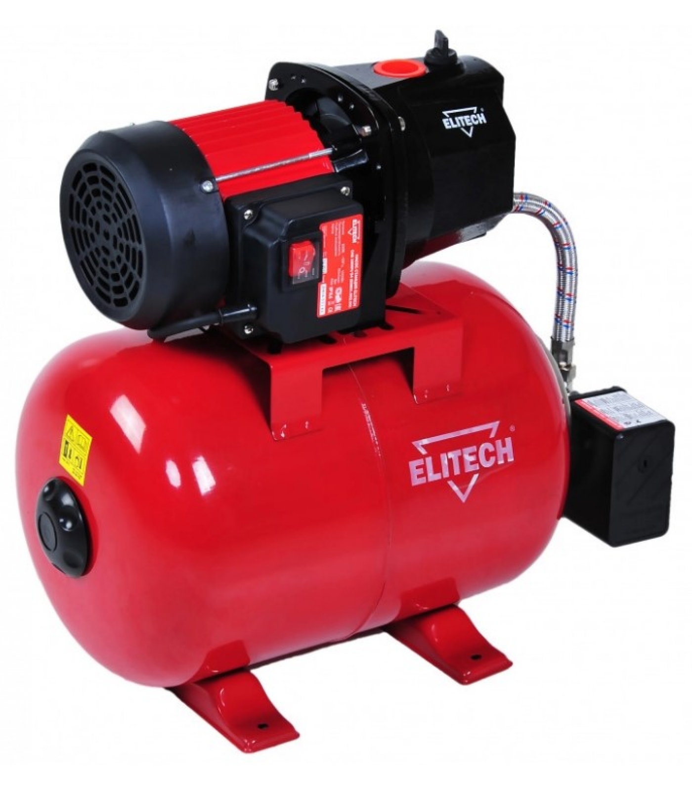 Насосная станция Elitech САВ 1000Ч/24 для чистой воды. Имеет встроенный гидроаккумулятор и датчик давления (прессостат) для работы в автоматическом режиме. Обязательное условие работы с установленным обратным клапаном на всасывающем шланге.