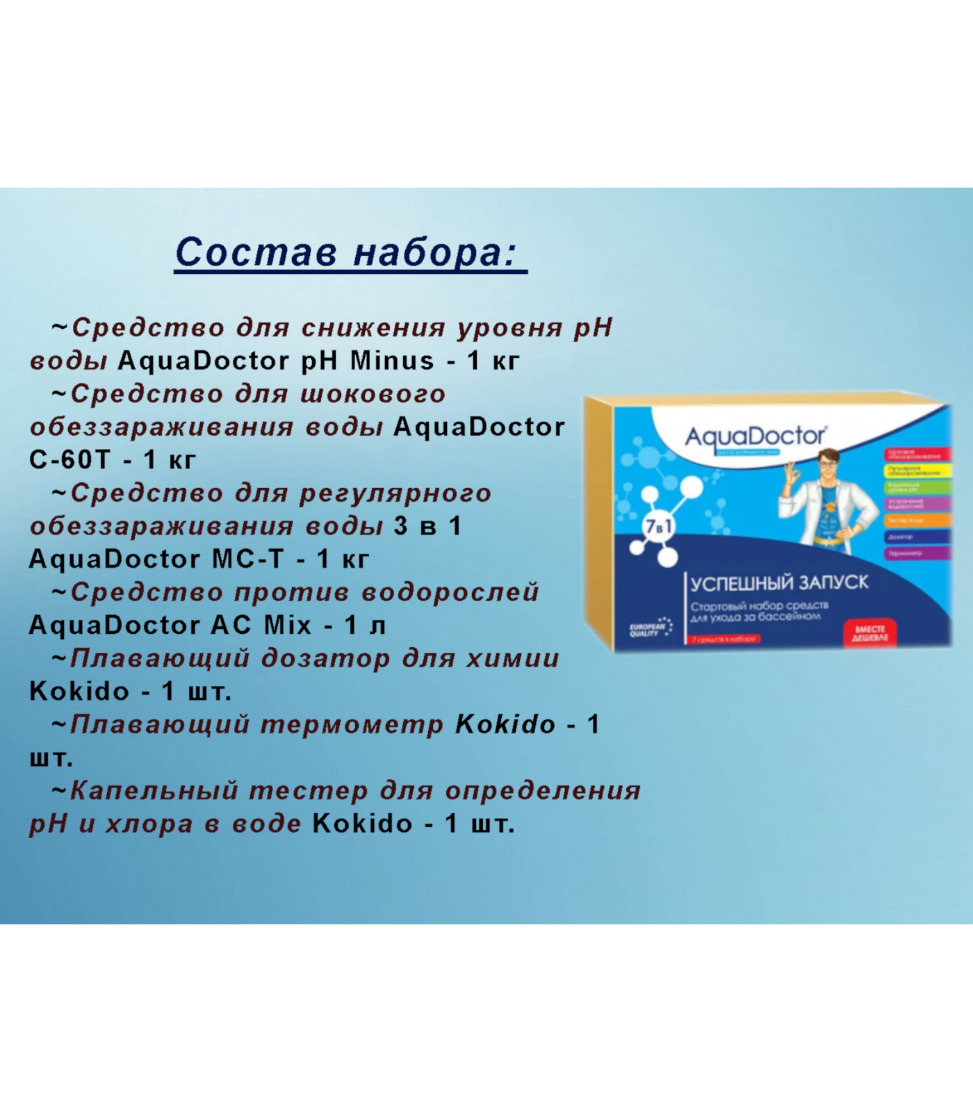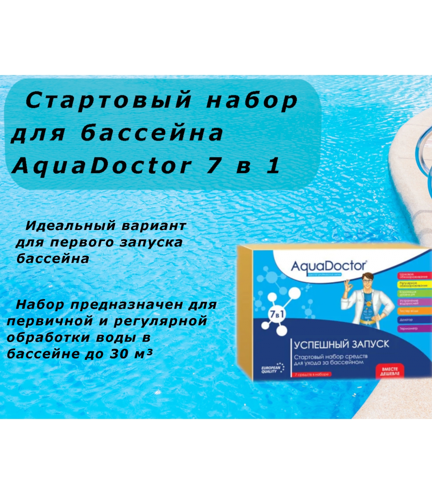 Стартовый набор для бассейна AquaDoctor 7 в 1 - идеальный вариант для первого запуска бассейна! Набор предназначен для первичной и регулярной обработки воды в бассейне до 30 м³. Все препараты и аксессуары подобраны для комплексного применения и гарантируют чистую и прозрачную воду в вашем бассейне.