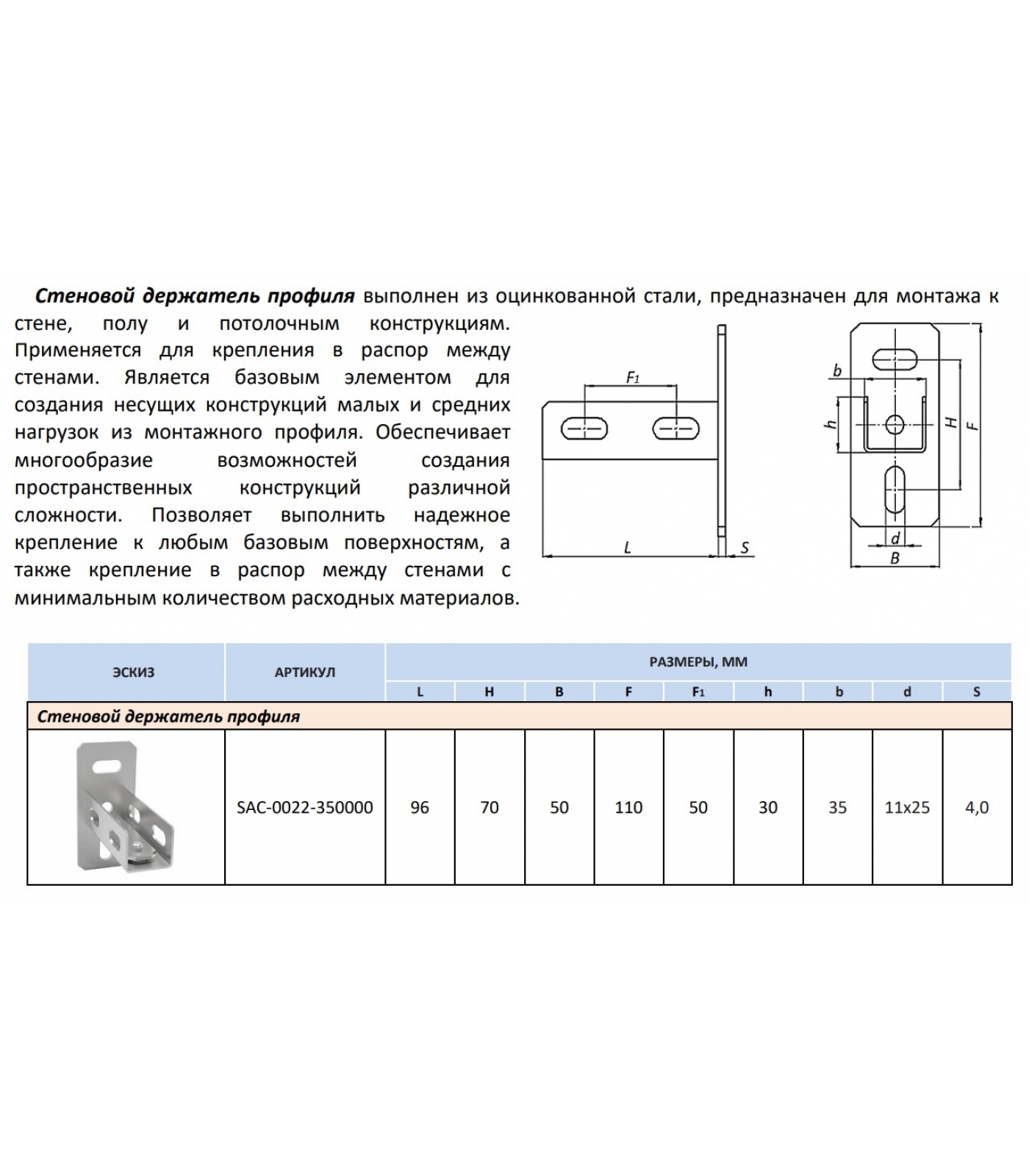 Стеновой держатель профиля выполнен из оцинкованной стали, предназначен для монтажа к стене, полу и потолочным конструкциям. Применяется для крепления в распор между стенами. Является базовым элементом для создания несущих конструкций малых и средних нагрузок из монтажного профиля. Обеспечивает многообразие возможностей создания пространственных конструкций различной сложности. Позволяет выполнить надежное крепление к любым базовым поверхностям, а также крепление в распор между стенами с минимальным количеством расходных материалов.