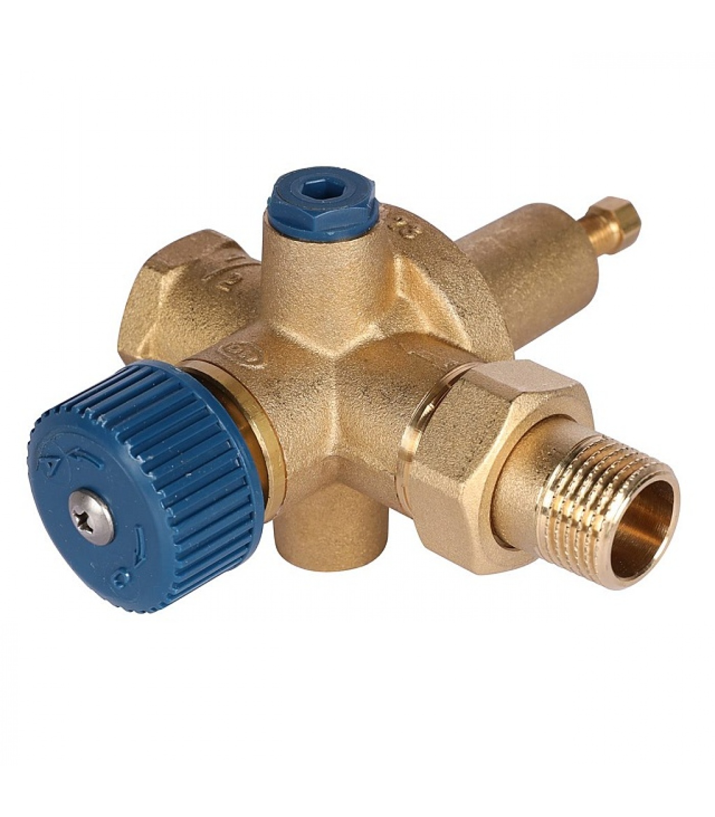 Во время заполнения или пополнения системы кран перекрывает поток теплоносителя по достижении давлением заданного значения, поддерживая его на постоянном уровне. Фильтр из металлической микросетки, расположенный в нижней части системы, позволяет очистить воду от твердых частиц, которые могут нарушить работу устройства. Уплотнение обратного клапана на выходе устройства не допускает возврата воды из отопительного контура в трубопровод. Кроме того, система заполнения снабжена двумя резьбовыми отверстиями, которые дают возможность подсоединить манометр для мониторинга давления в системе и запорный кран с ручным приводом, позволяющий изолировать воду в отопительной системы от воды в подающем трубопроводе путем простого вращения нижнего маховика с накаткой. Это особенно удобно при проведении работ по техническому обслуживанию системы или в случае аварии.