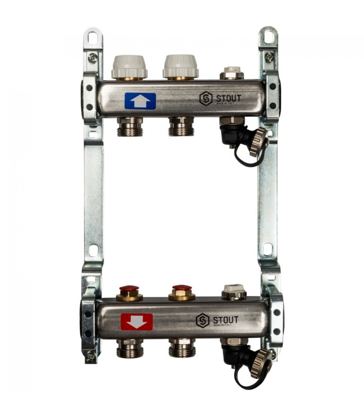 Коллектор из нержавеющей стали STOUT без расходомеров, с клапаном вып. воздуха и сливом 2 вых.