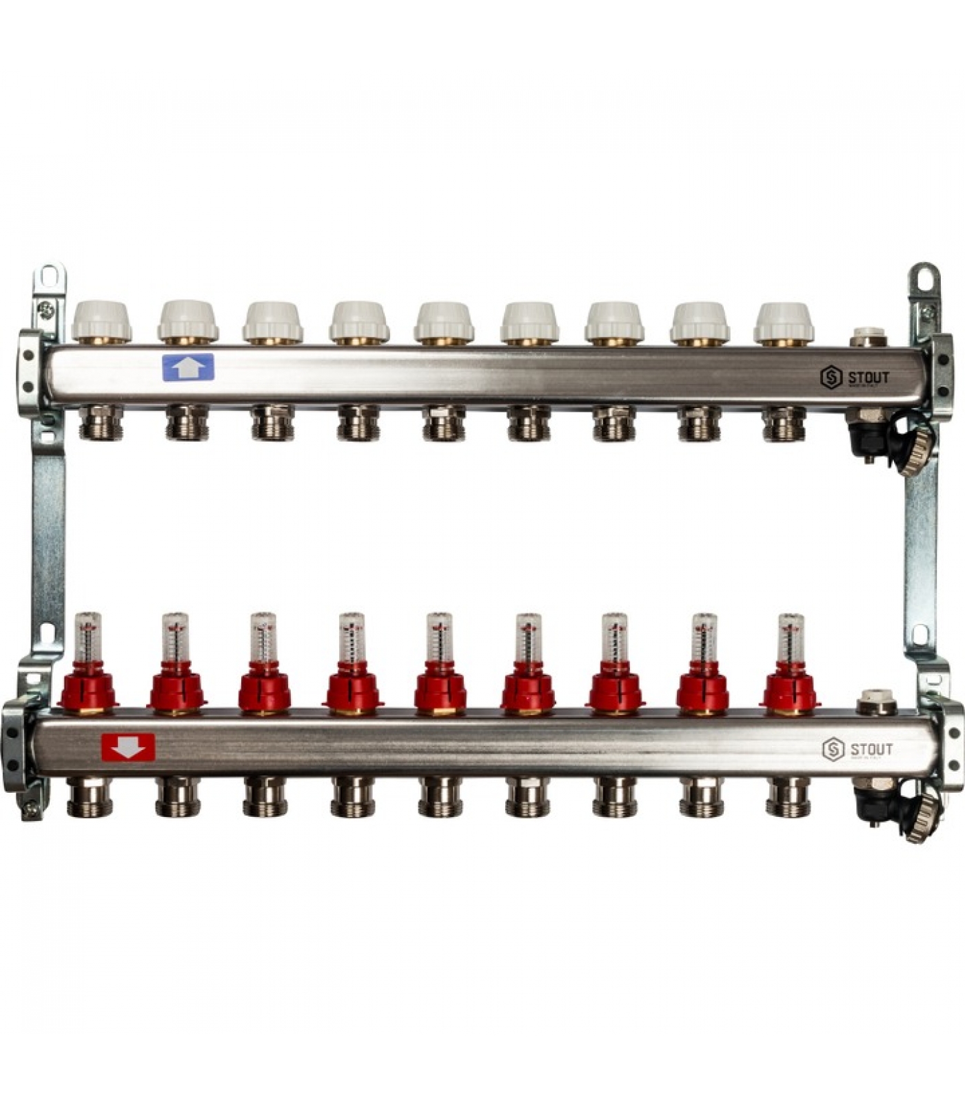 Коллектор из нержавеющей стали STOUT с расходомерами, с клапаном вып. воздуха и сливом 9 вых.